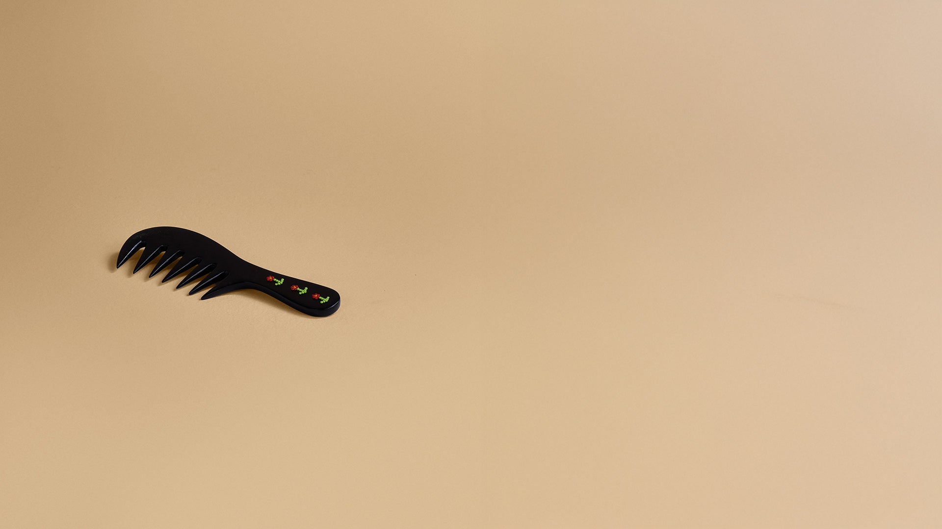 This handcrafted wide-toothed comb is made from polished mango wood in a rich dark brown shade, with the handle adorned with dainty glass bead flowers. Both practical and decorative, it brings a refined touch to your dressing table.