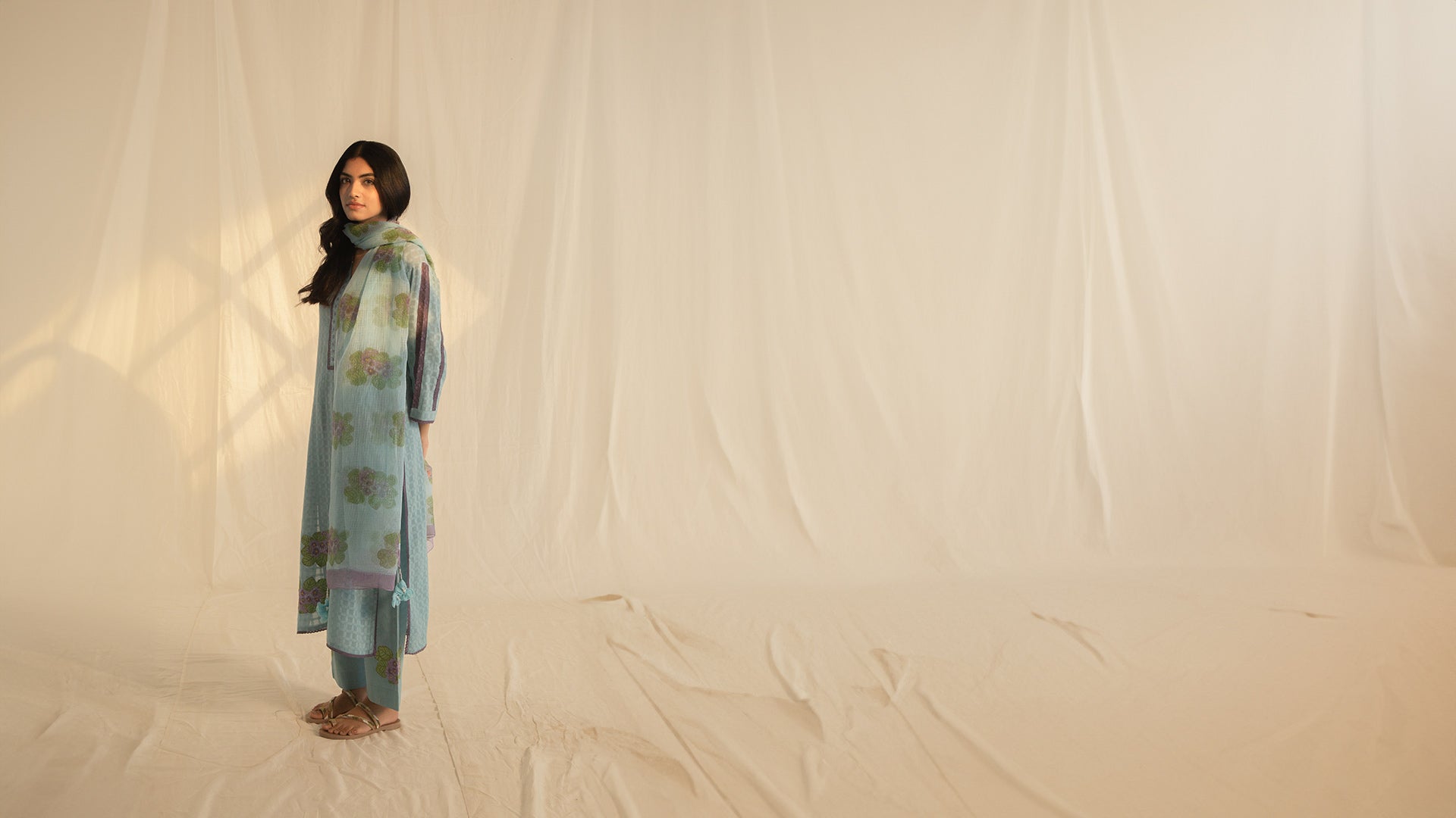 A gorgeous hand-dyed Kota Doria dupatta featuring beads, fabric edging, and Hand-Block Printed appliqués of African Violet flowers.