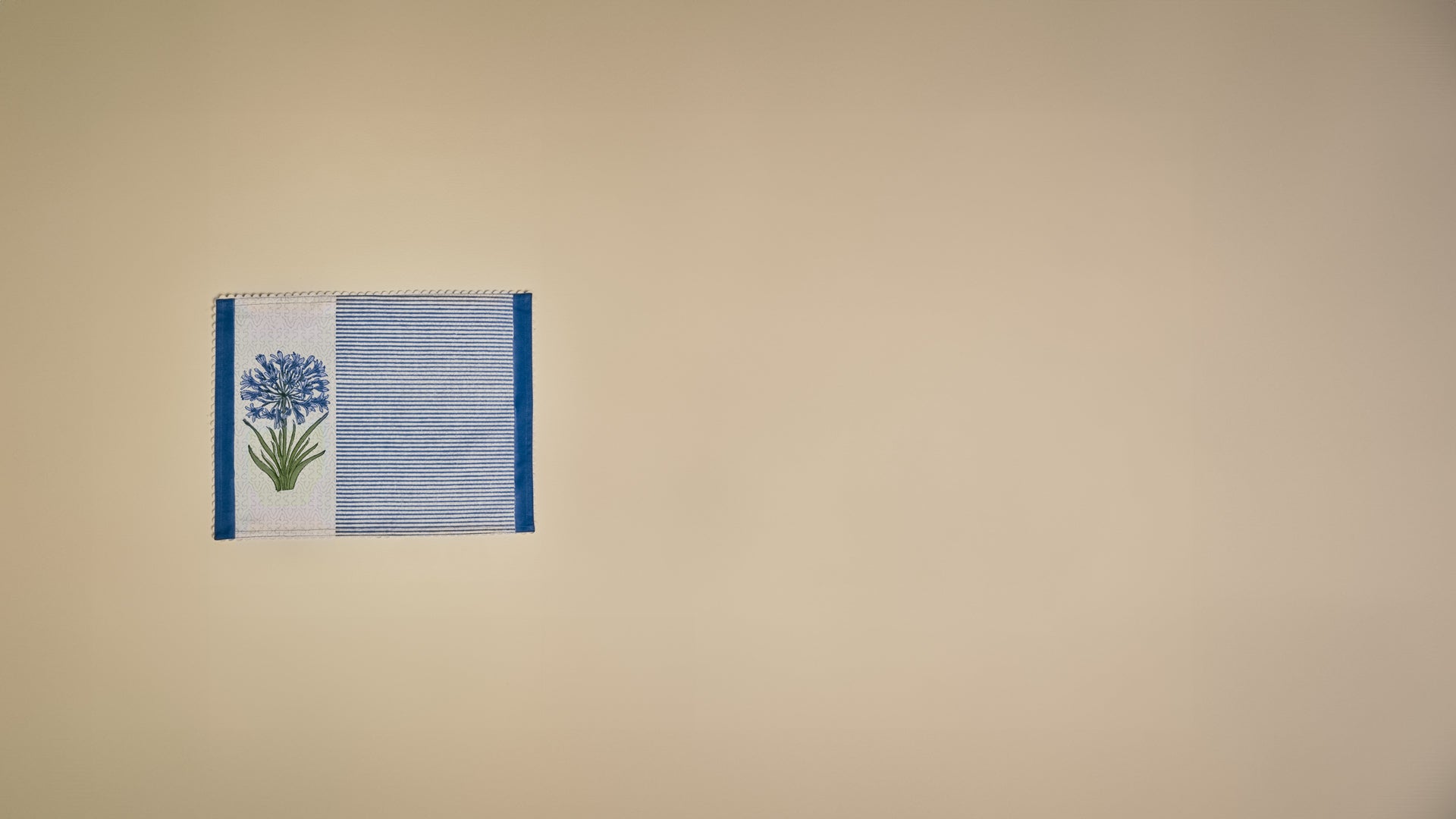 The Agapanthus Table Mat features a striking hand-block printed blue agapanthus flower, paired with a contrasting blue and white striped design. Bordered in deep blue stripe on the widths and an all around white crochet trim.