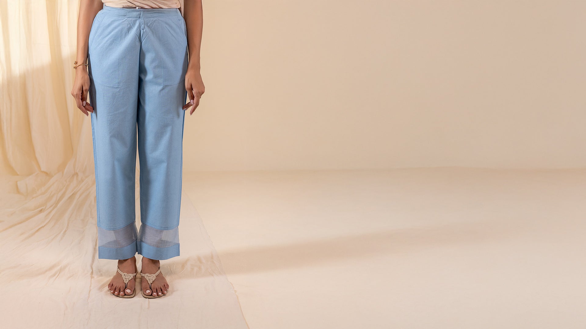 These pale dusty blue straight cotton pants feature a Chanderi insert near the hem for a refined touch. With two side pockets and a semi-elasticised waist with drawstring, they combine comfort and effortless style.
