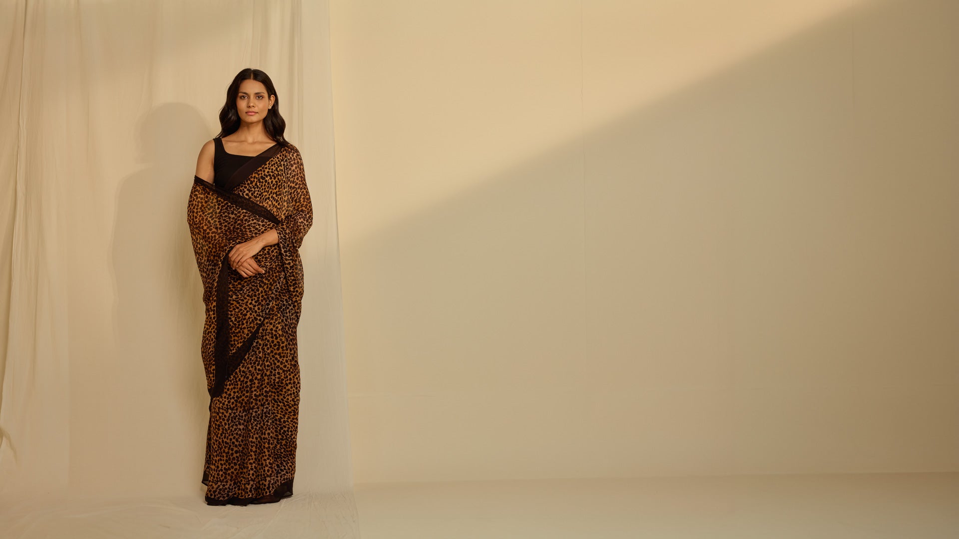 Make a bold statement with the Animal Attack Chiffon Saree in a striking leopard print. Crafted from lightweight chiffon, this saree drapes beautifully, offering both elegance and comfort. The dynamic animal print adds a touch of fierce style, making it perfect for any occasion where you want to stand out with confidence and grace.