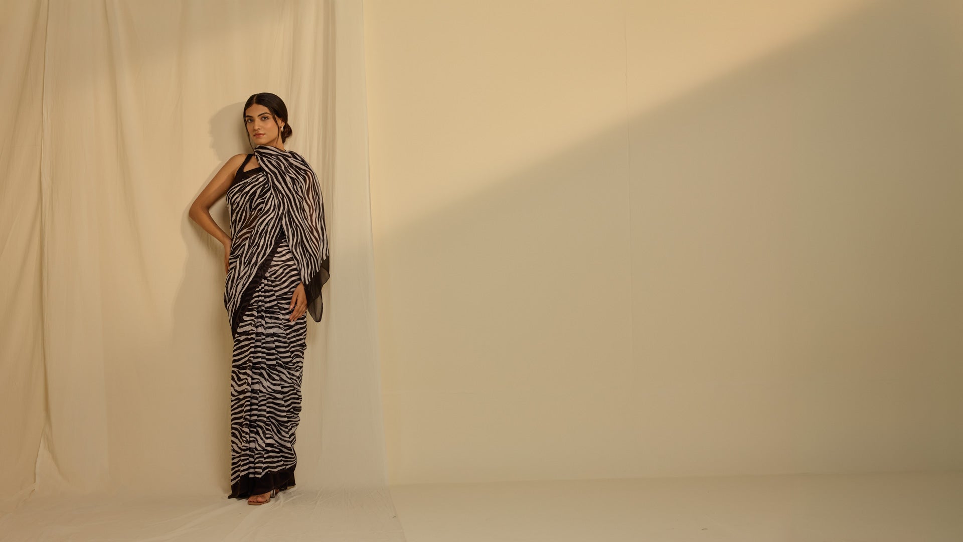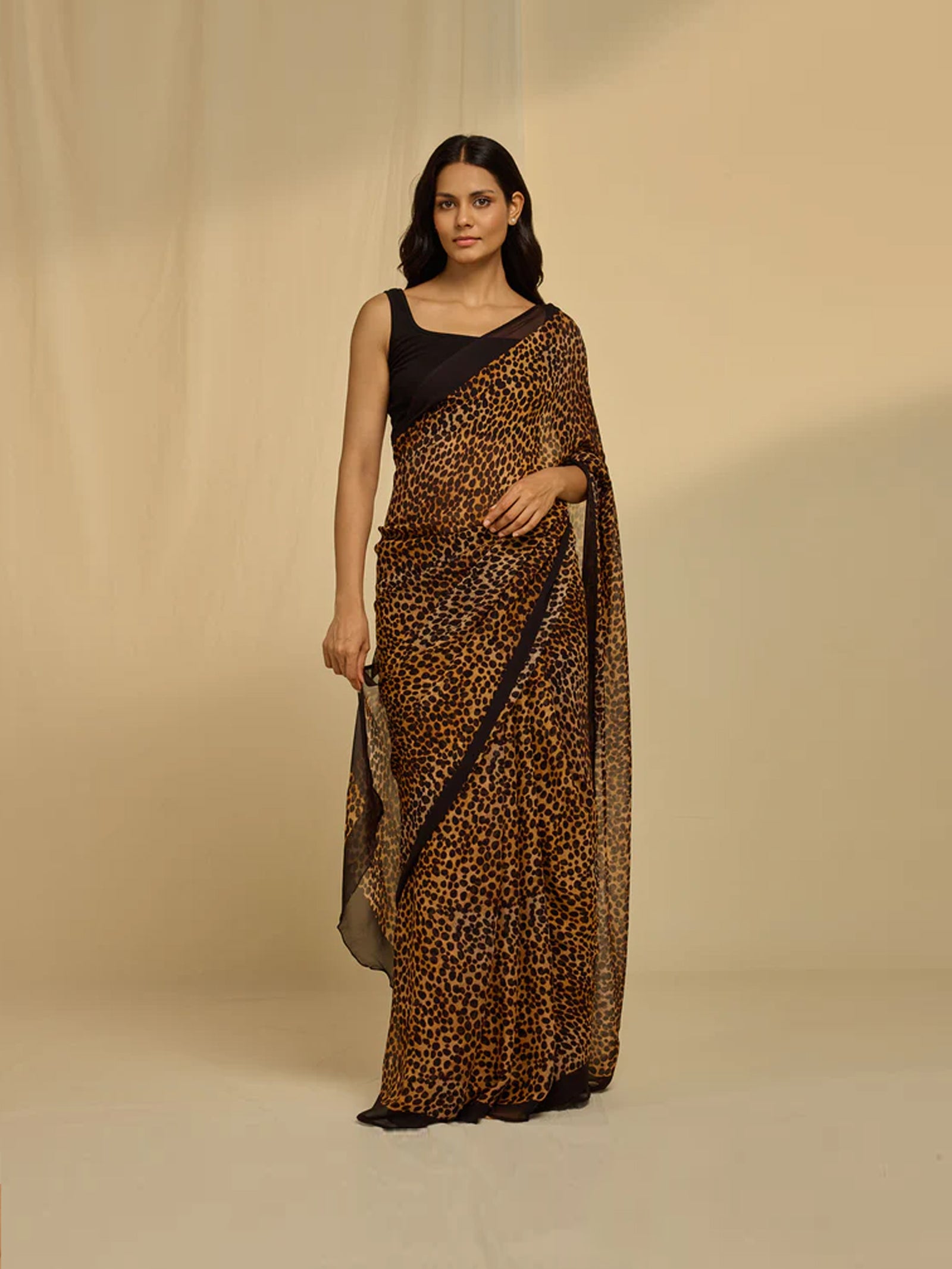 Embrace bold style with the Animal Attack Chiffon Saree in a striking zebra print. Made from lightweight chiffon, this saree drapes effortlessly, offering a blend of comfort and sophistication. The black and white zebra pattern adds a dynamic, contemporary flair, making it a perfect choice for those who love to make a statement with their attire.