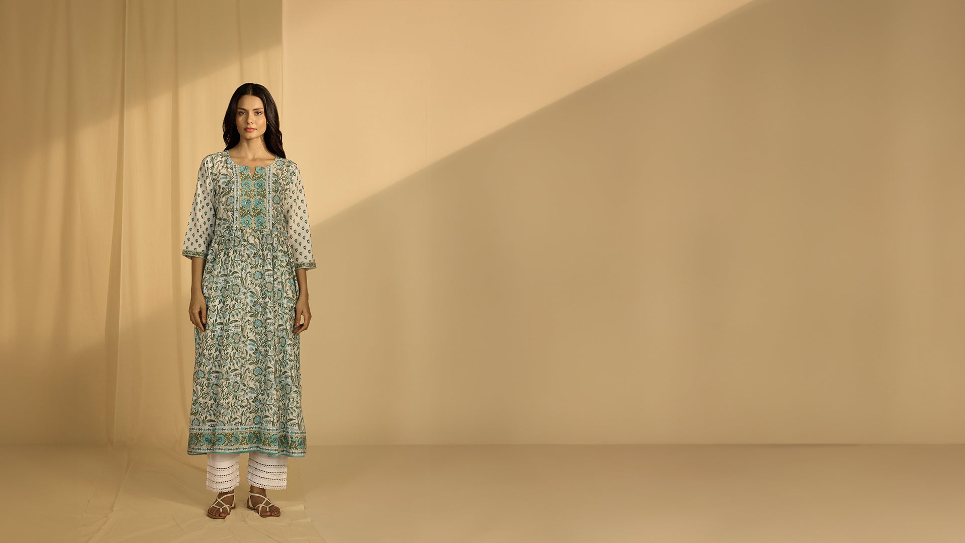 The Bada Mor Cotton Kurta is crafted from cotton with a light blue and beige hand-block printed design. It features sequins and border Embellishment on the sleeve cuffs and yoke, along with gathers at the yoke and blue lace edging at the flare.