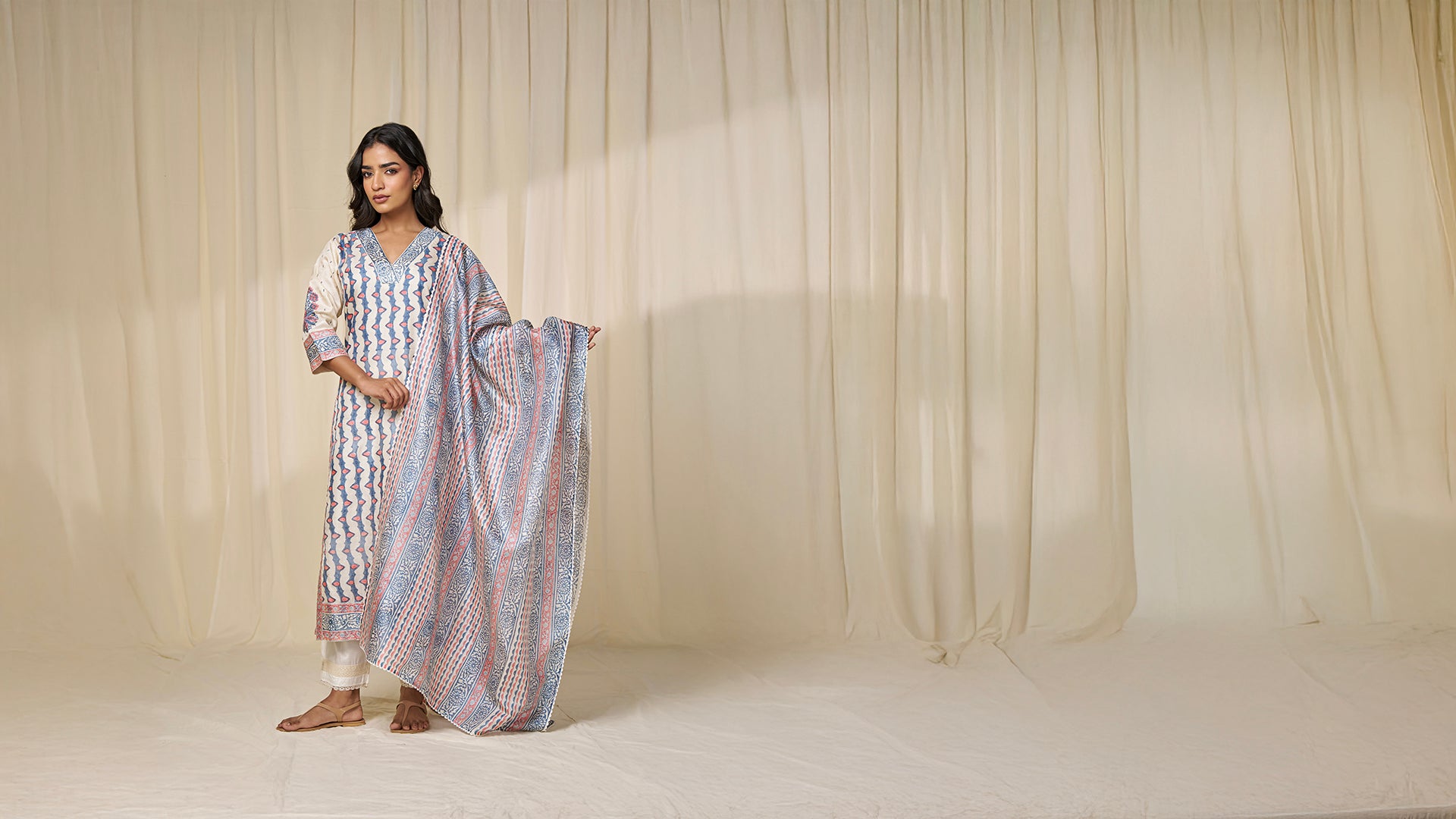 The hand block printed tussar silk dupatta is printed with floral and abstract borders in the shades of blue and scarlet. An all over scalloped lace edging completes the look.