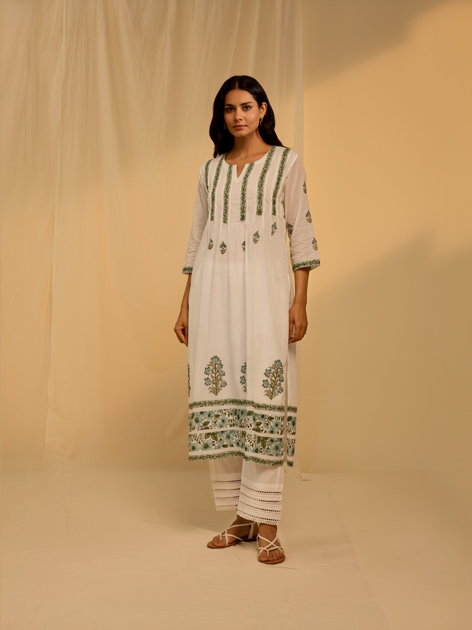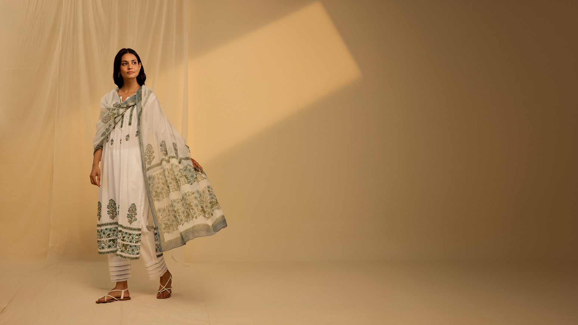 The Barely Blue Kota Dupatta features an intricate floral print in soft blue and green hues, surrounded by a blue border. Crafted in lightweight Kota fabric, this dupatta drapes elegantly, adding a delicate touch to your ensemble.