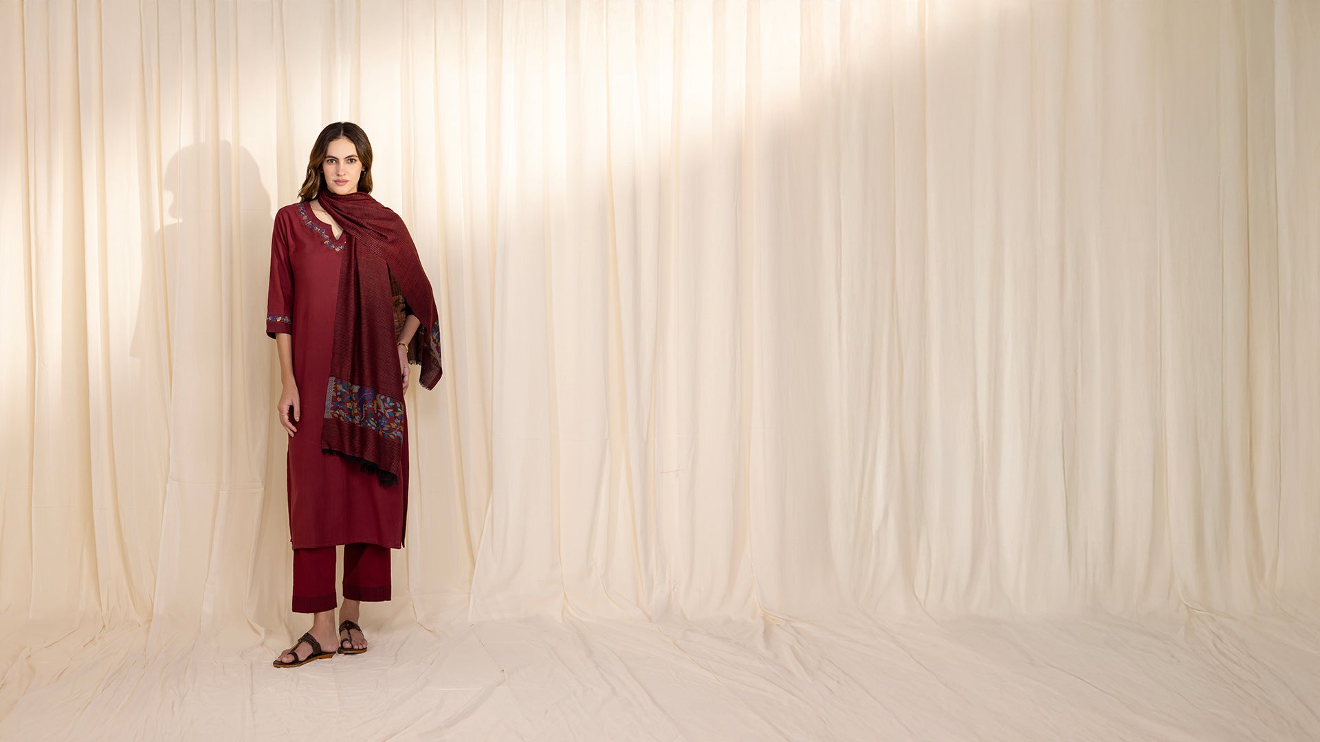 The Berry Twill Kurta features a split round neck detailed with black hand-block printed stripes that are framed by floral embroidery. The same stripes and floral embroidery accent the elbow-length sleeve hems. Its simple, yet elegant straight cut silhouette is perfect for everyday wear.