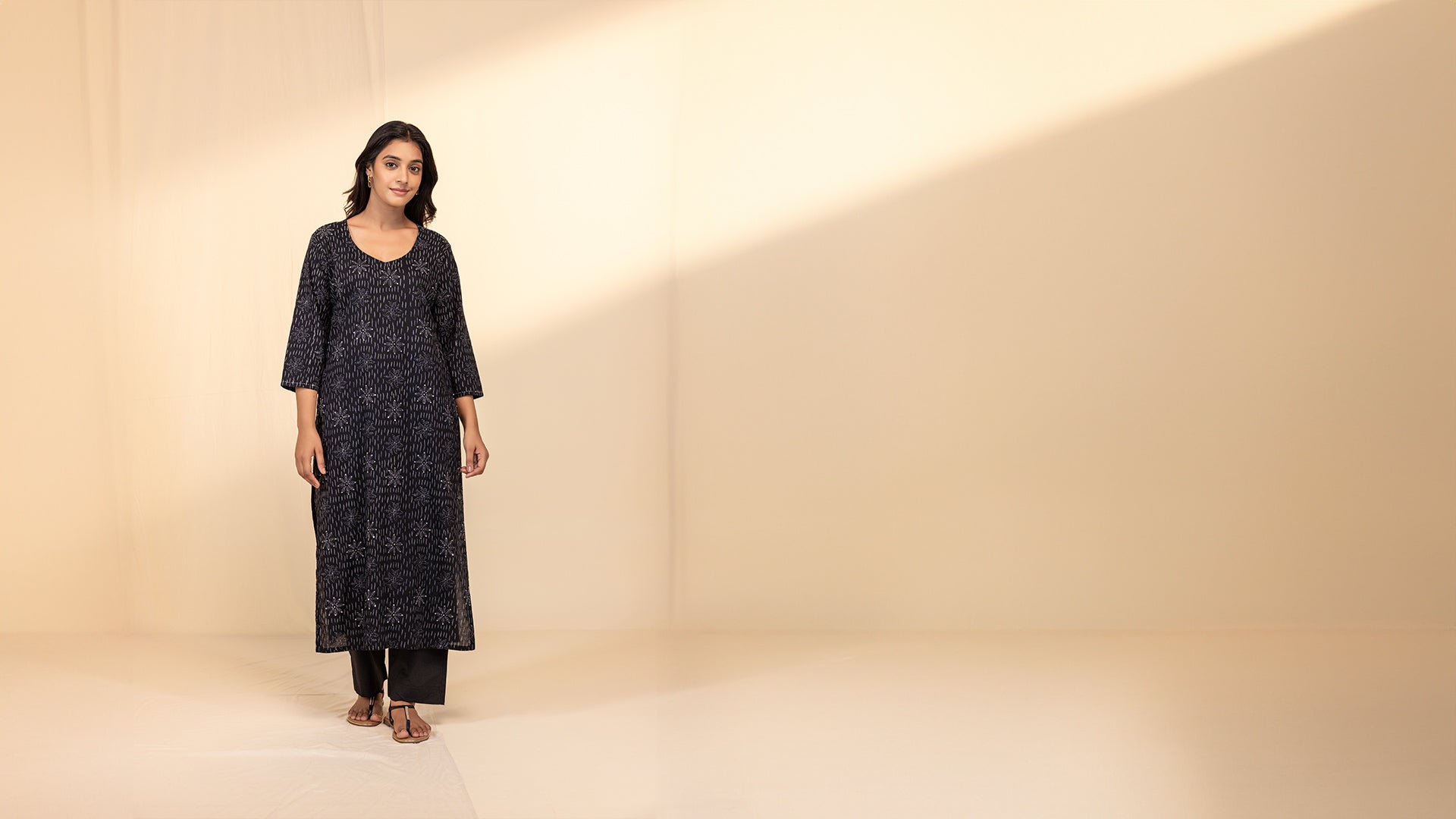 This elegant black cotton kurta features intricate Kantha embroidery and delicate sequin embellishments. The kurta's hand-block printed pattern adds a timeless charm, while the three-quarter sleeves and relaxed silhouette offer comfort for any occasion.