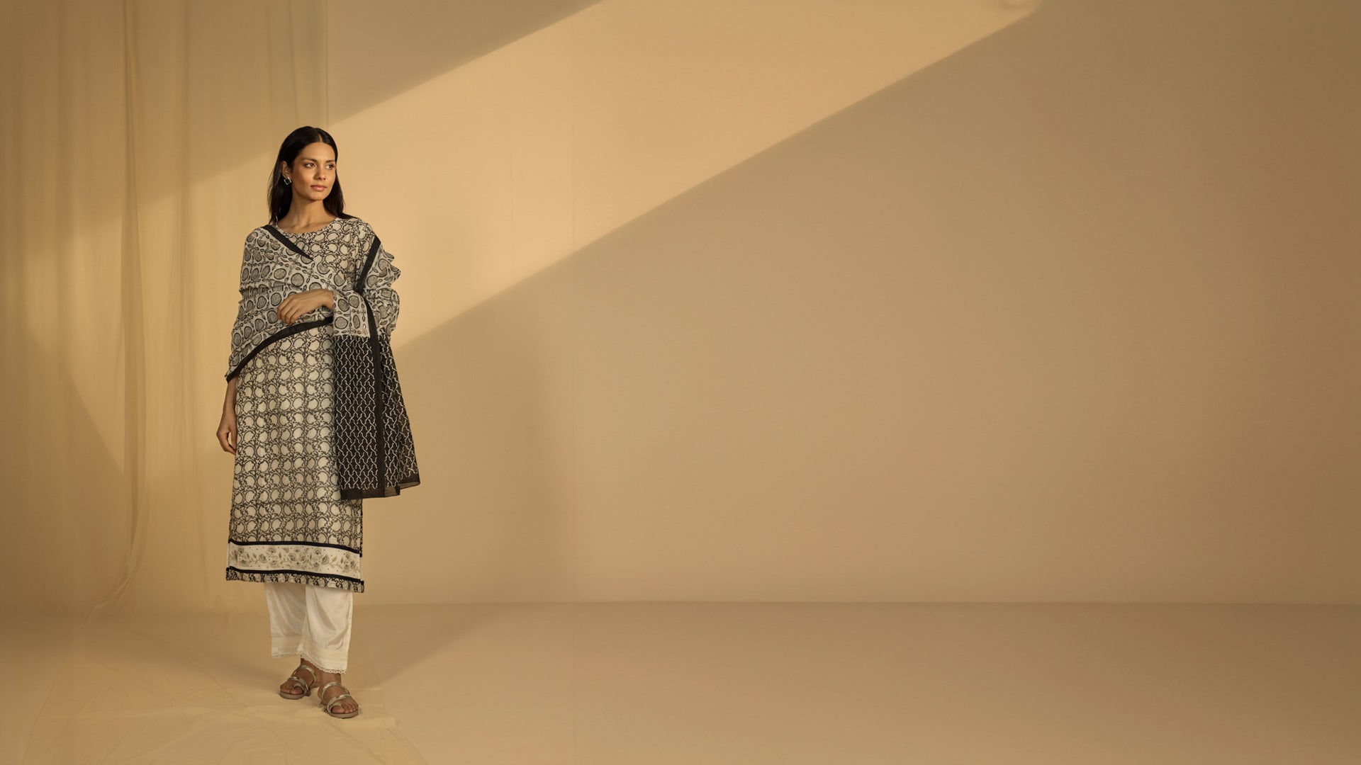 The Black and Gold Embroidered Chanderi Dupatta features a striking circular motif with gold and silver Aari-tari and gota-patti embroidery on a sheer black base. The dupatta's thick contrasting geometric border adds a refined touch, perfect for elevating any outfit with its elegant design.