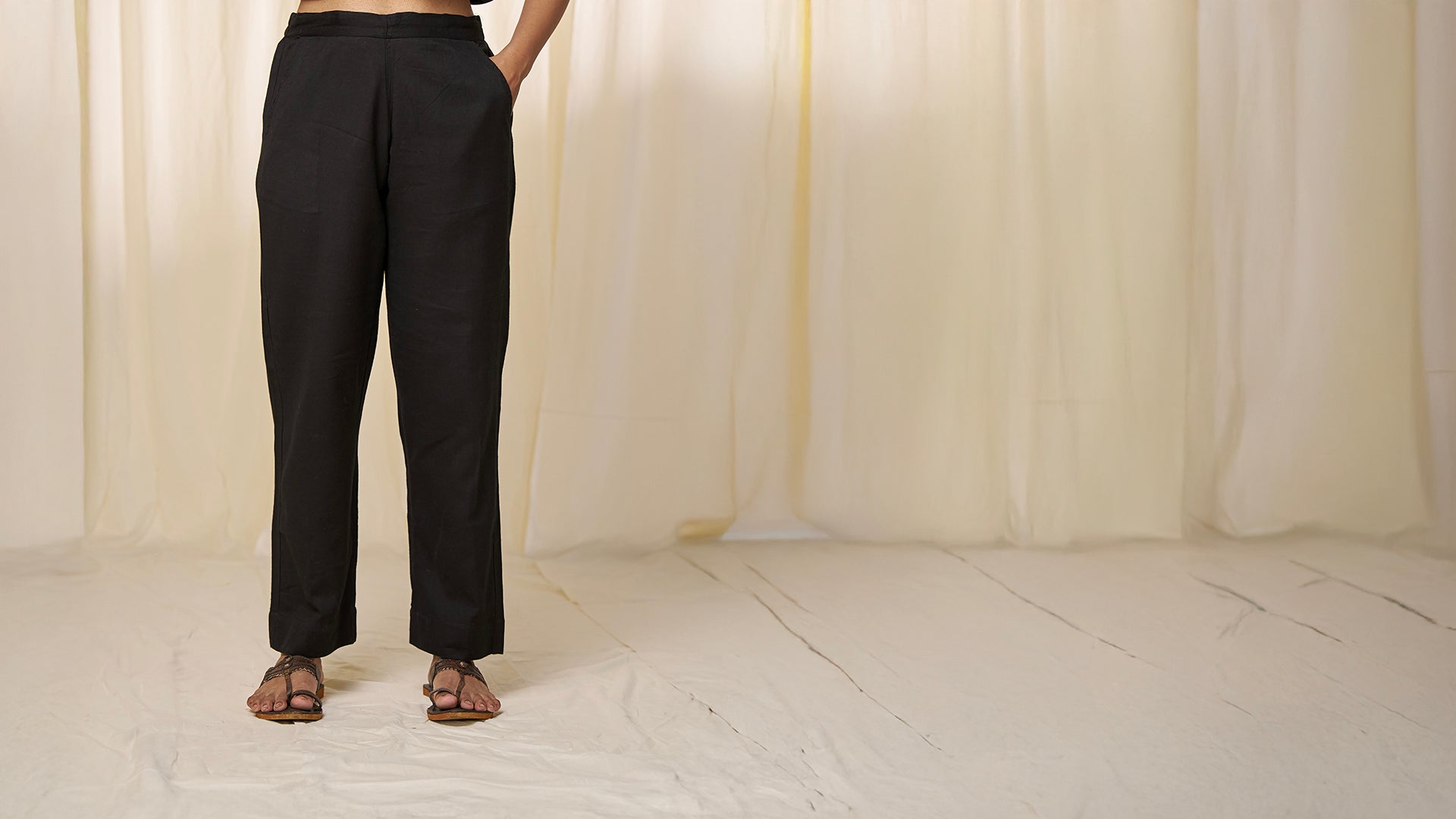 These straight cut black twill pants come with two side pockets and a semi elasticised waist with a drawstring for a comfortable fit.