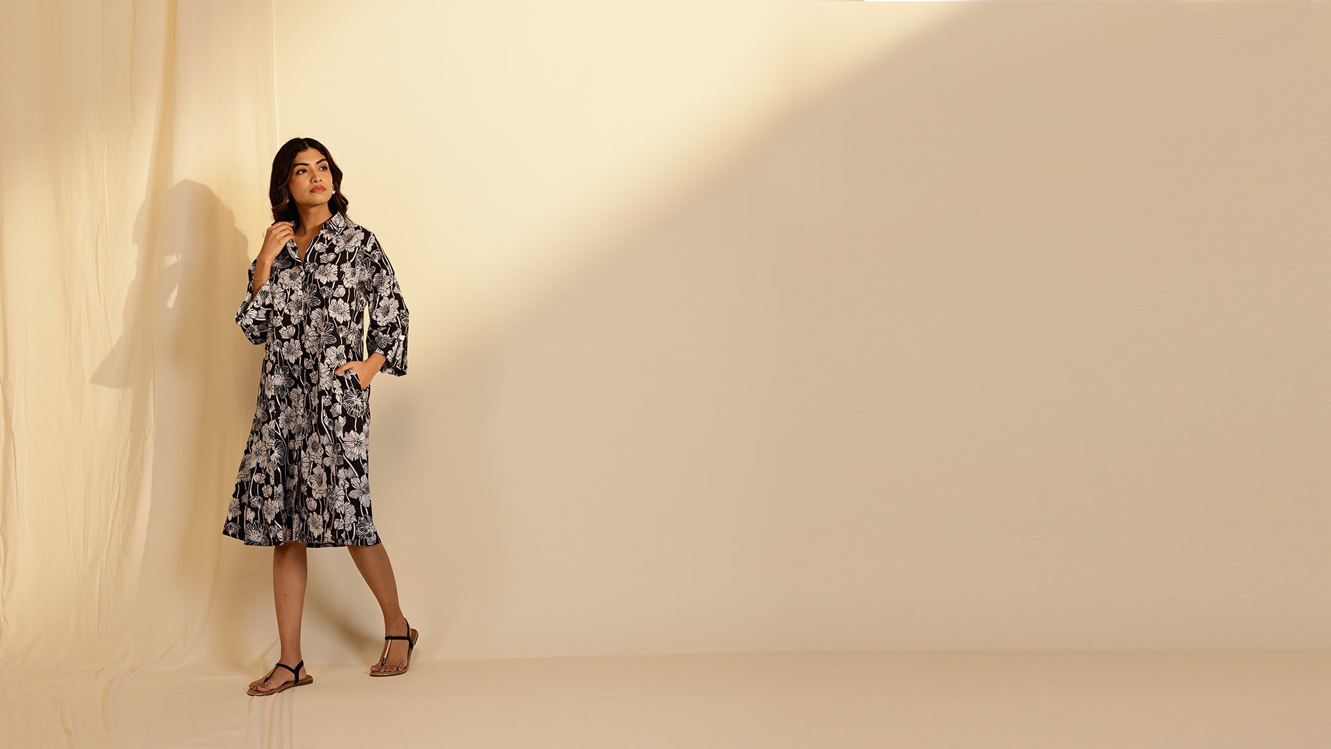 This relaxed-fit casual dress showcases a striking monochrome palette, hand-printed with a garden of white flowers on a deep black base. Designed with a collared, buttoned neckline and smart foldable sleeves, it blends effortless style with timeless charm.