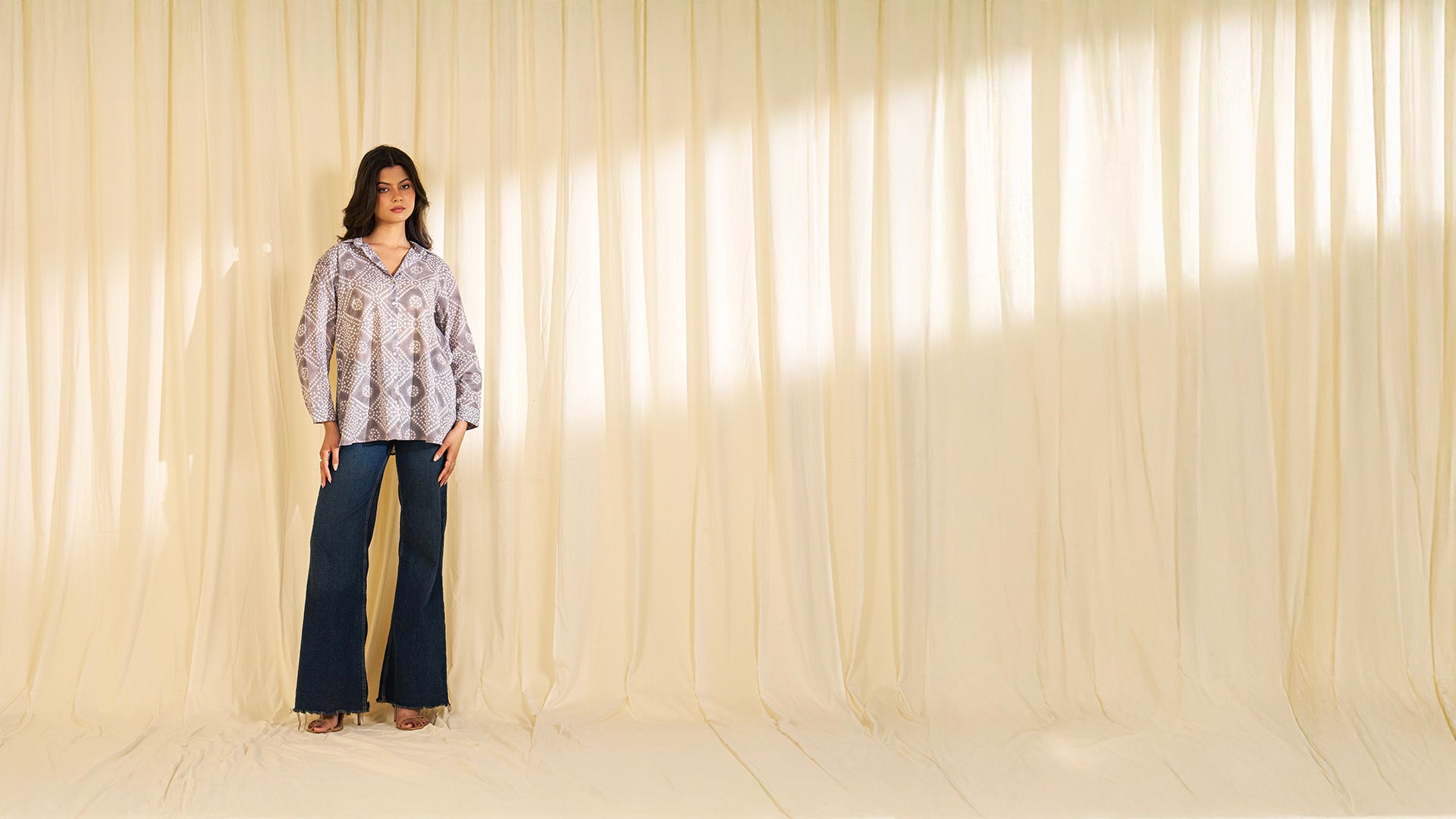 This stone-grey voile straight fit shirt features geometric hand block prints inspired by traditional Bandhej tie and dye. It's designed with a collared button down front-opening with shell buttons, and finished with full-length sleeves and open cuffs with buttons.