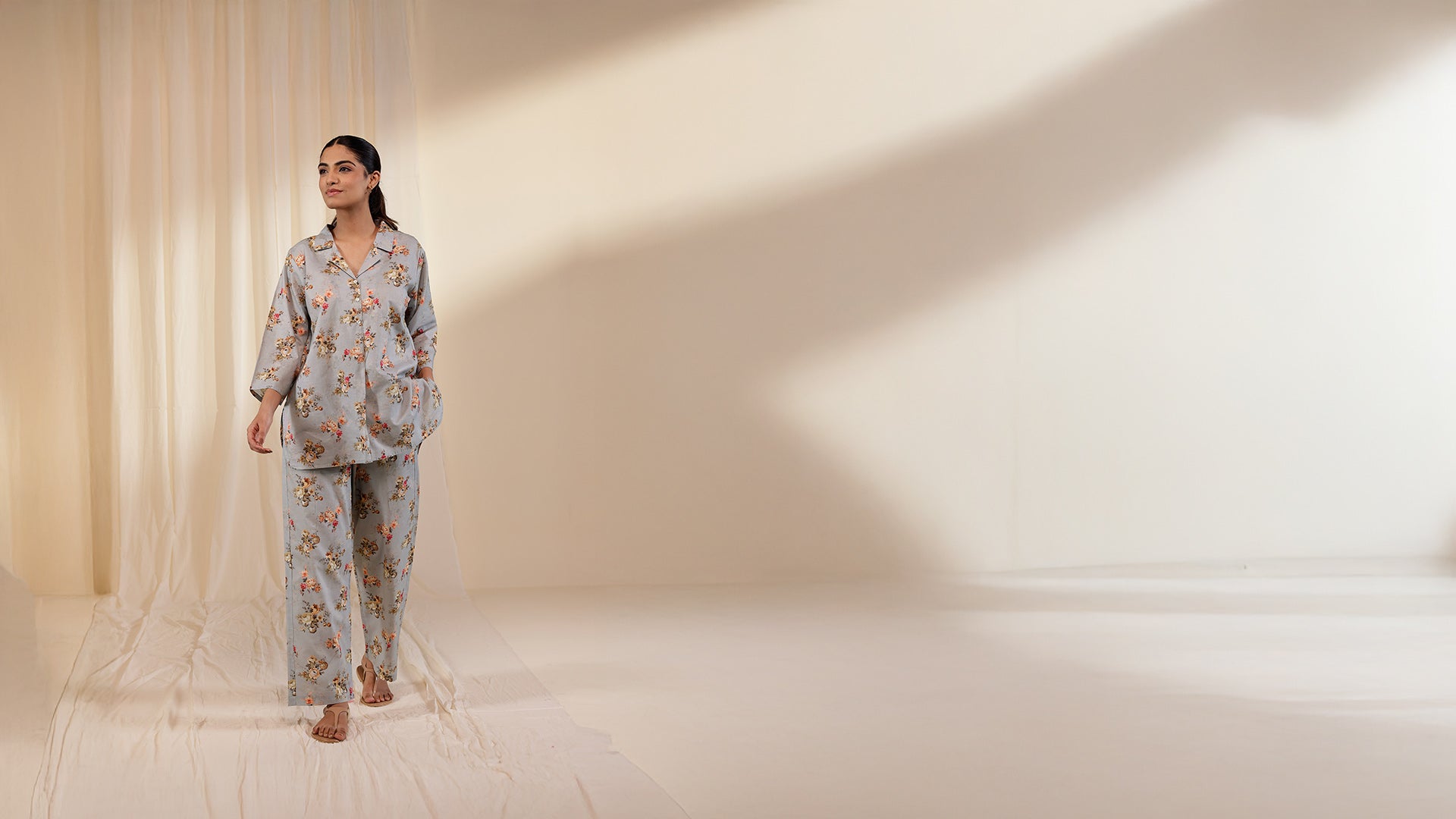 These night suits feature a half front-open collared shirt detailed with delicate shell buttons and tailored in a relaxed fit for all-night comfort. The three-fourth sleeves offer ease, while the coordinating pants come with a semi-elasticised waist, drawstring, and two side pockets for everyday practicality.