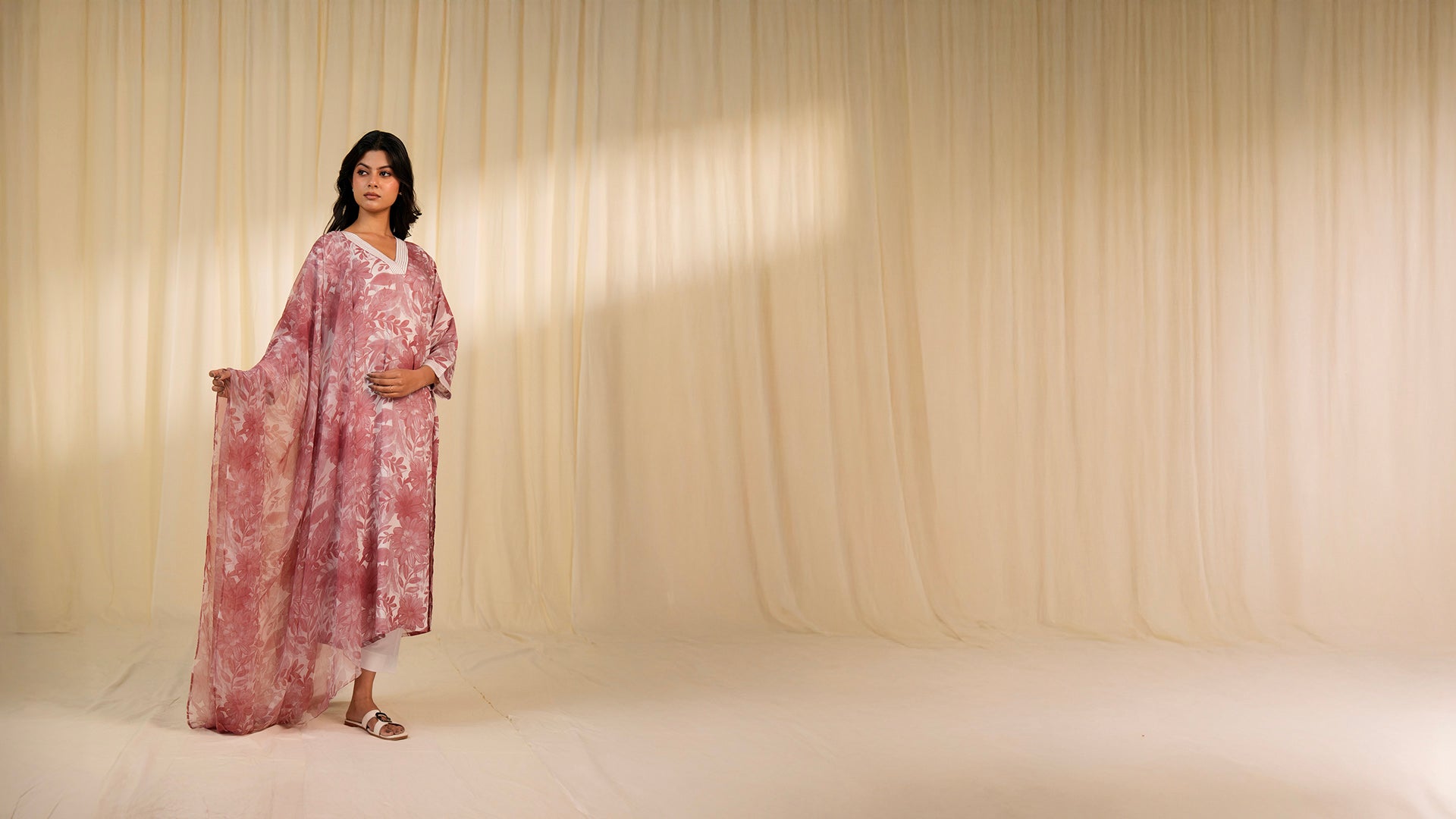 This relaxed-fit, straight-cut kurta with a V neckline, features an all-over floral print in pastel maroon tones. The neckline and 3/4 sleeves are accented with Kantha stitch detailing for subtle texture. It's two side pockets make it functional and fashionable.