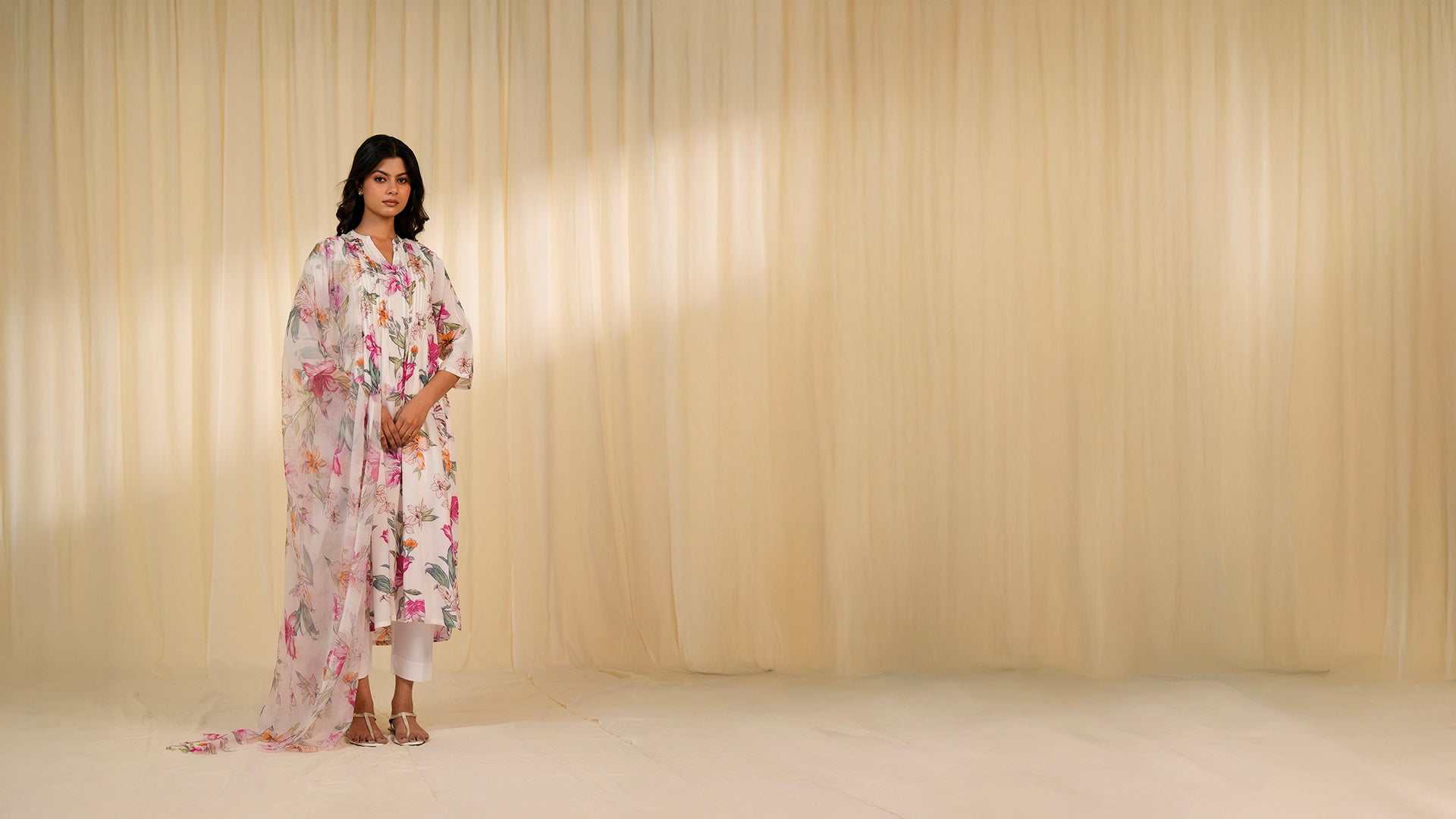 This white, straight-cut, 3/4 sleeve, viscose kurta, is printed with large lilies in pink, orange, purple, and green offering a fresh, vibrant look. The mandarin V collar and fine knife pleats on the front and back yoke add gentle structure and textured detail.