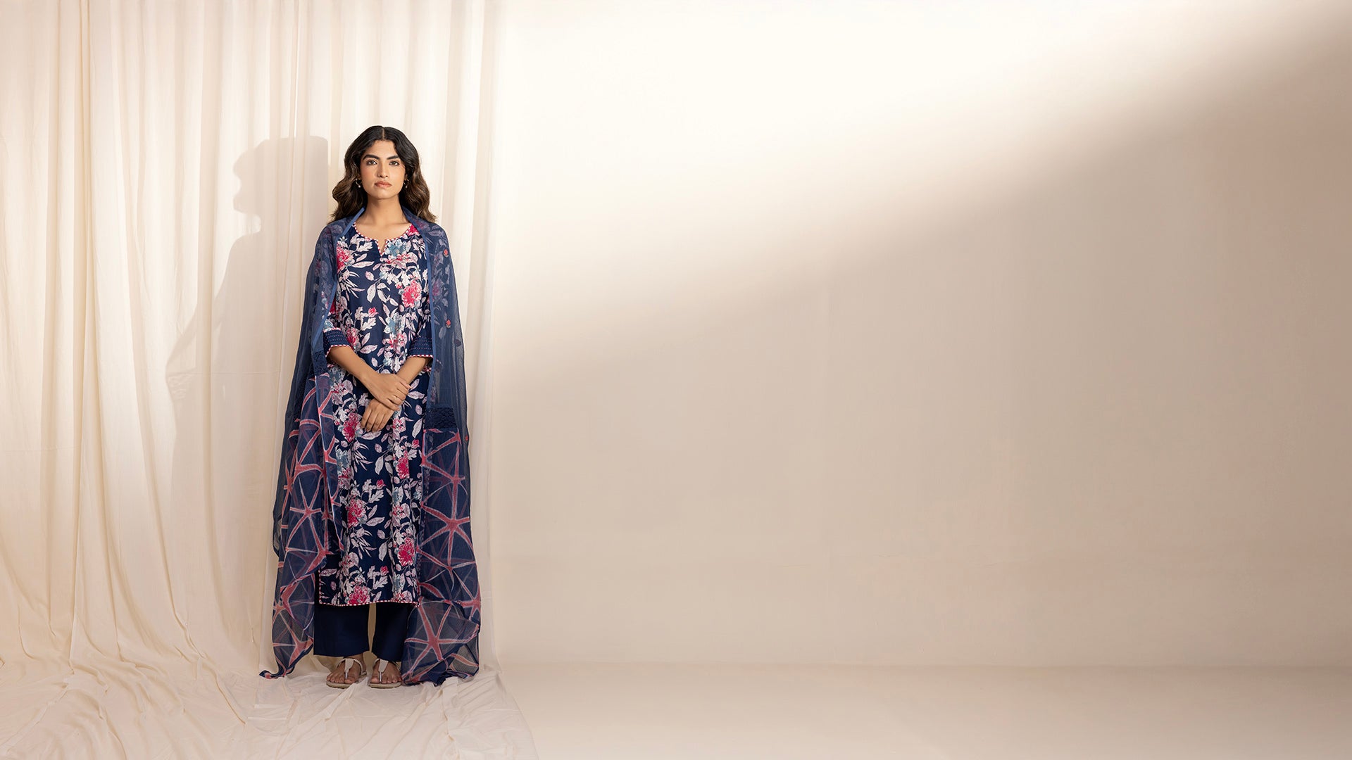 This V-neck navy-blue voile kurta features bold machine-printed flowers in hot pink and smoky blue. The 3/4 sleeves have finely pleated cuffs adorned with 4 rows of red glass beads and the entire kurta is trimmed with hand block printed red and white check piping. Modern, feminine and elegant.