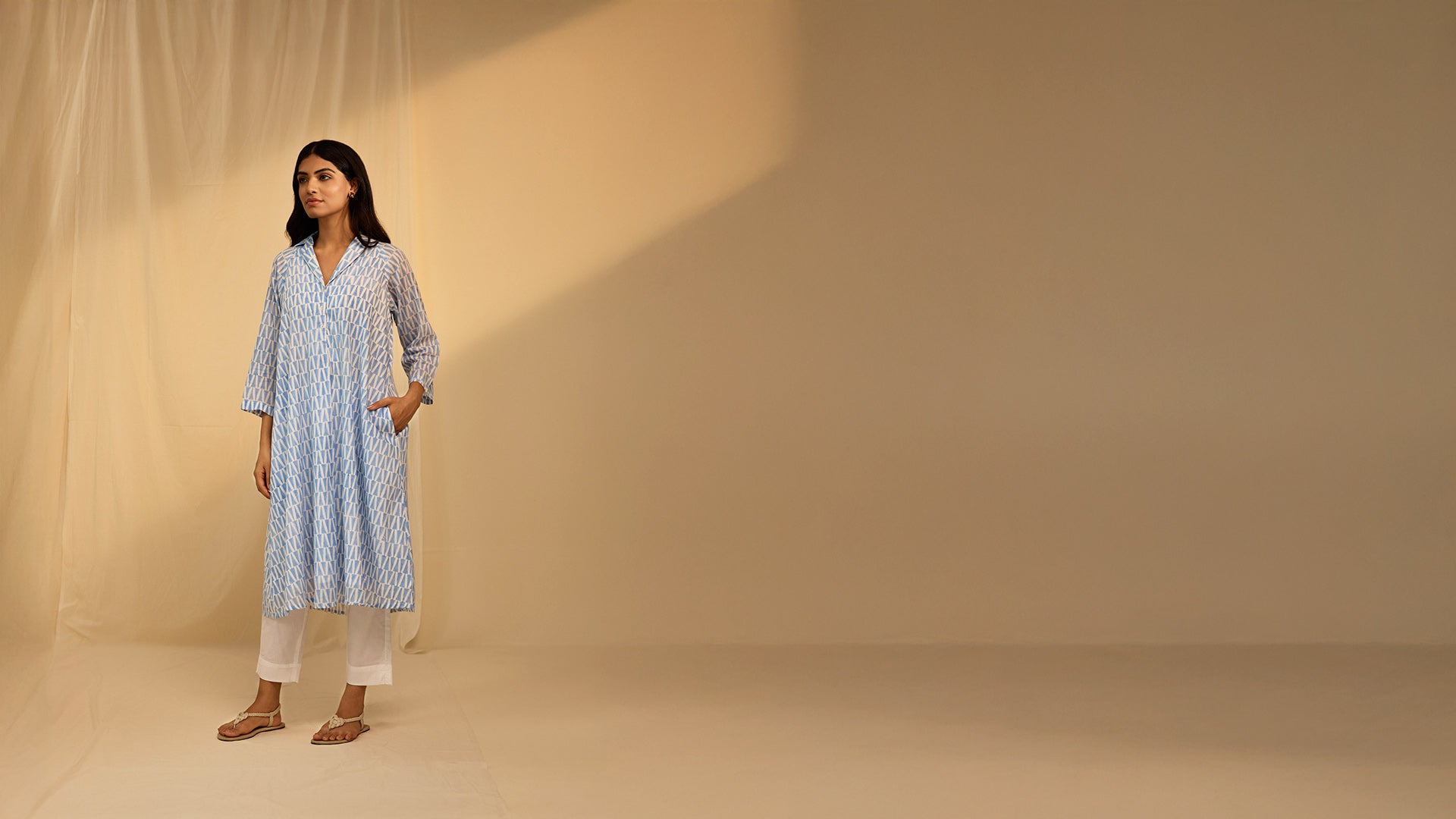 This voile kurta features a refreshing geometric abstract print in light blue, bringing a contemporary touch to a classic silhouette. It is tailored in an A-line cut with a collared neckline and front placket adorned with shell buttons. Lined with voile for added comfort, the kurta includes box pleats at the front and back, offering a graceful and easy fit.