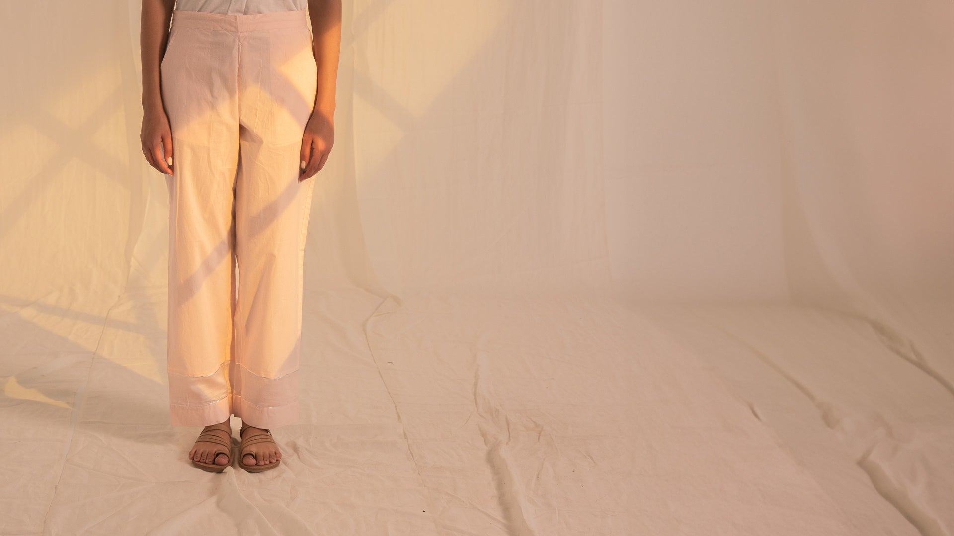 These baby pink cotton pants feature a Chanderi fabric border with silver gota lace Embellishment at the hem. Designed with a semi-elasticised waistband, an internal drawstring, and two side pockets for comfort and versatility, they are perfect for pairing with both traditional and Western wear.