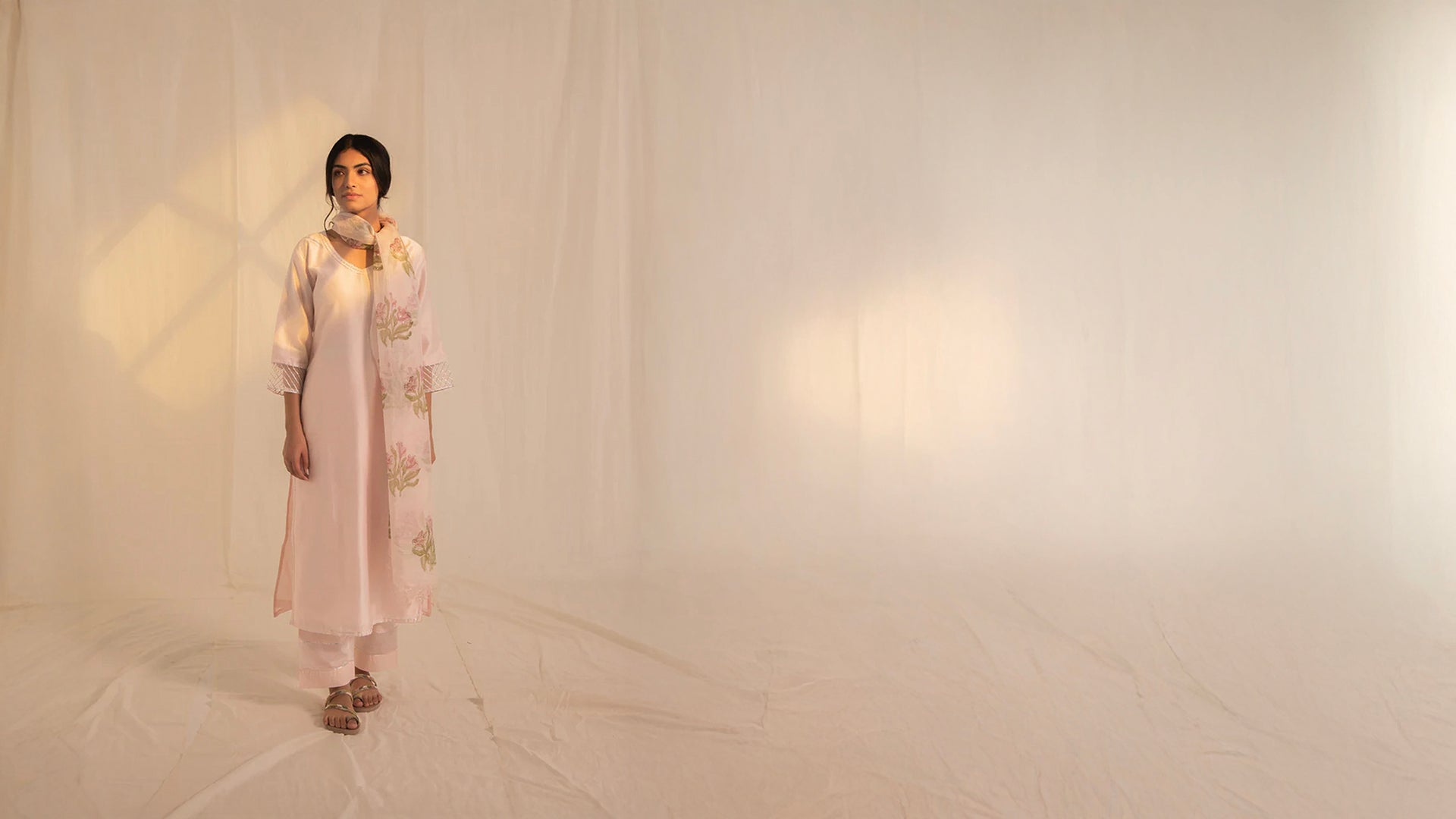 This exquisite Kota silk dupatta showcases an elegant hand-block print of floral patterns in soft hues. The delicate Mukaish embellishments add a touch of shimmer, making it perfect for elevating any outfit, whether for casual or festive occasions.