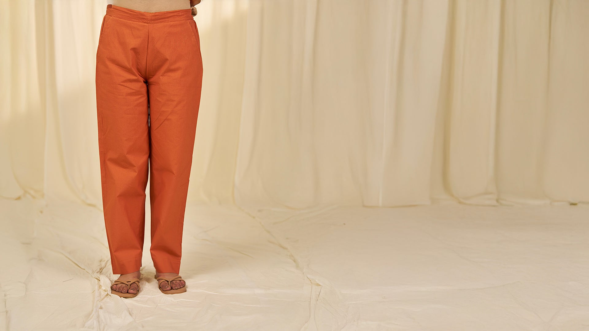 These burnt orange cotton pants with a straight silhouette are designed with two side pockets and a semi-elasticated waistband with drawstring for a comfortable fit.