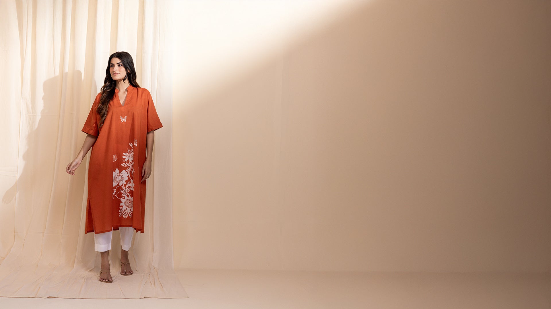 This very relaxed-fit tunic showcases a striking placement print of large white flowers and butterflies on a vibrant orange base, extending across both front and back. A small inverted box pleat at the back enhances ease and movement. Finished with a mandarin-collared V neckline, short cuffed sleeves, and two side pockets for comfort and style.