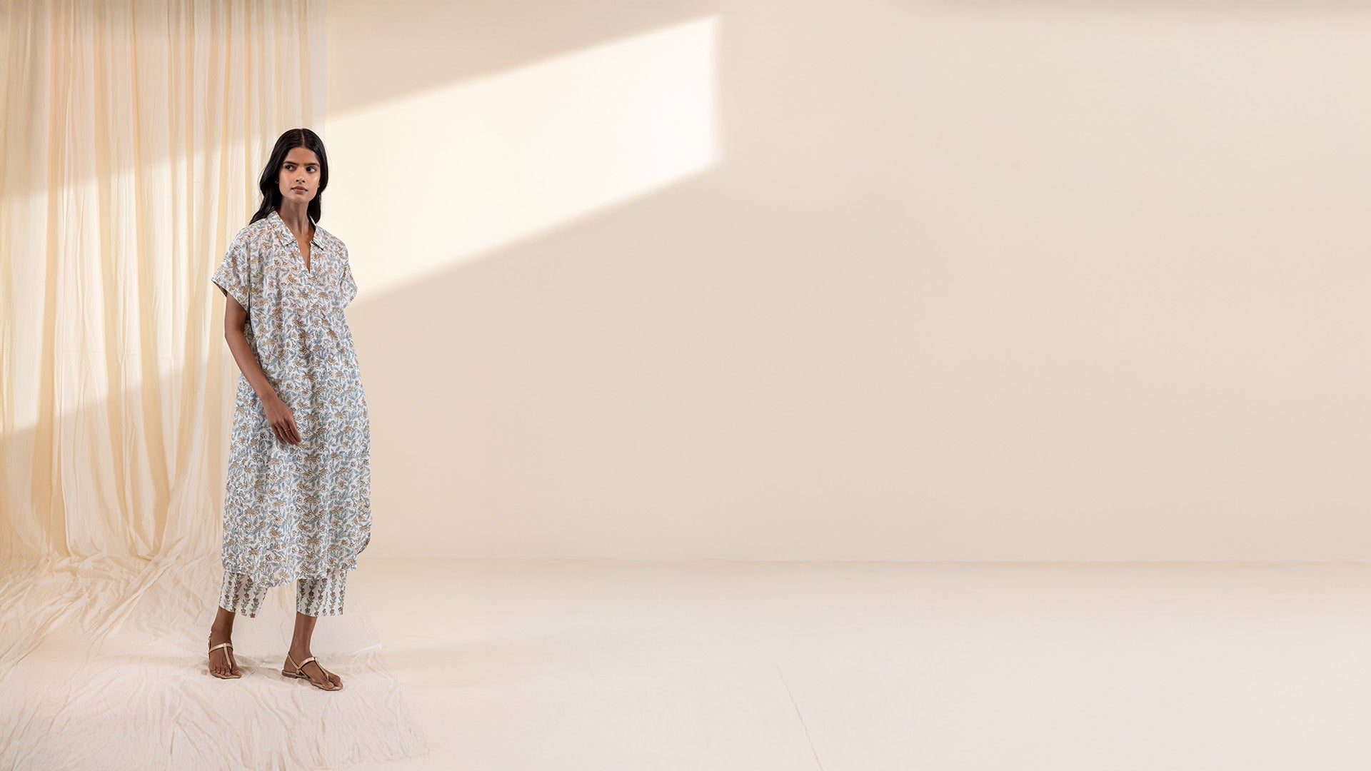 This long, relaxed-fit tunic features a soft floral spread of sandy-toned blooms and grey leaves printed across the fabric. Designed with short sleeves, a collared V neckline, and two side pockets, it offers both comfort and ease. Subtle side slits just below the pockets add a touch of movement to the silhouette.