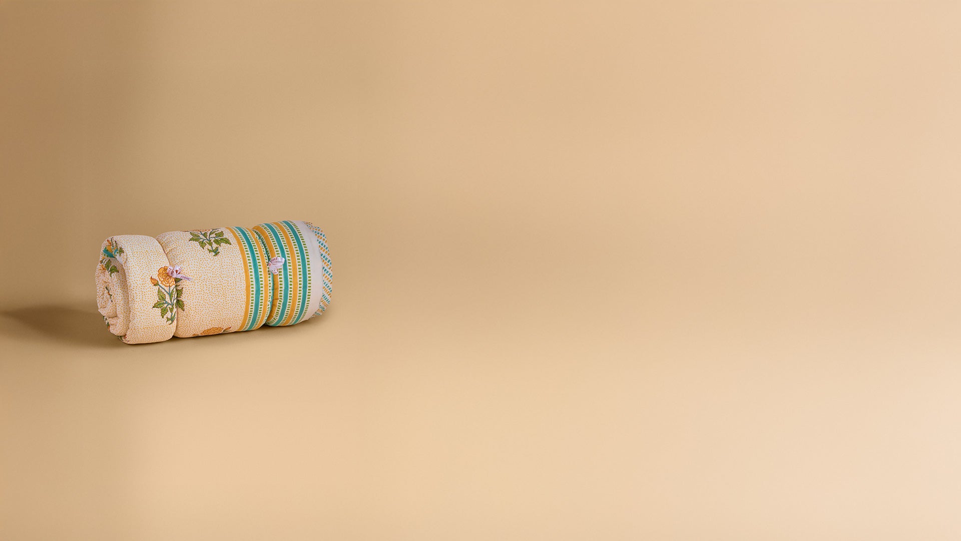 This soft voile quilt features hand block prints of roses in gold fusion with lime green leaves over a printed raindrop base. Framed with geometric borders in lime green, gold fusion and blue curacao, it offers a vibrant yet elegant look. The reverse showcases leafy and floral motifs in green and blue. A coordinated geometric flange, finishes the overall look. The quilts have pure cotton filling and are quilted with hand, in a patterned running stitch. The quilts are available in three different sizes.