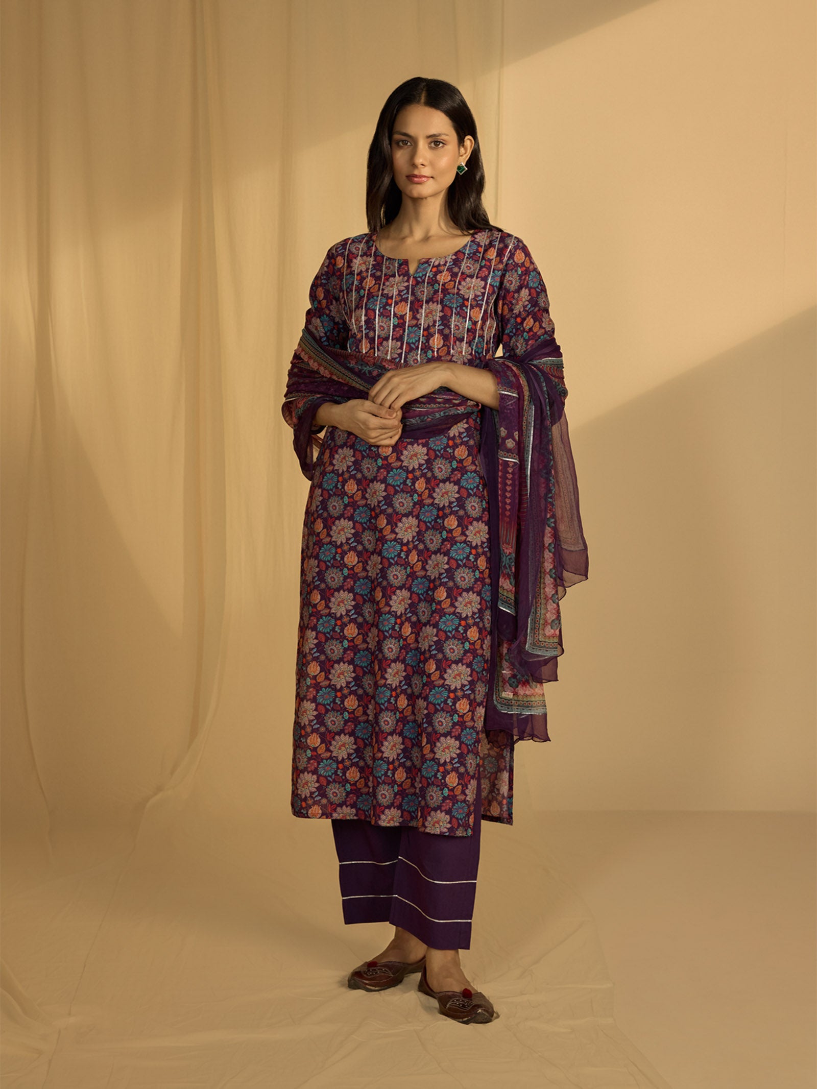 The Burma Cotton Kurta showcases a pattern of digitally printed floral bloomson a dark purple base. With its comfortable fit and breathable cambric cotton fabric, this kurta is perfect for both casual wear and special occasions.