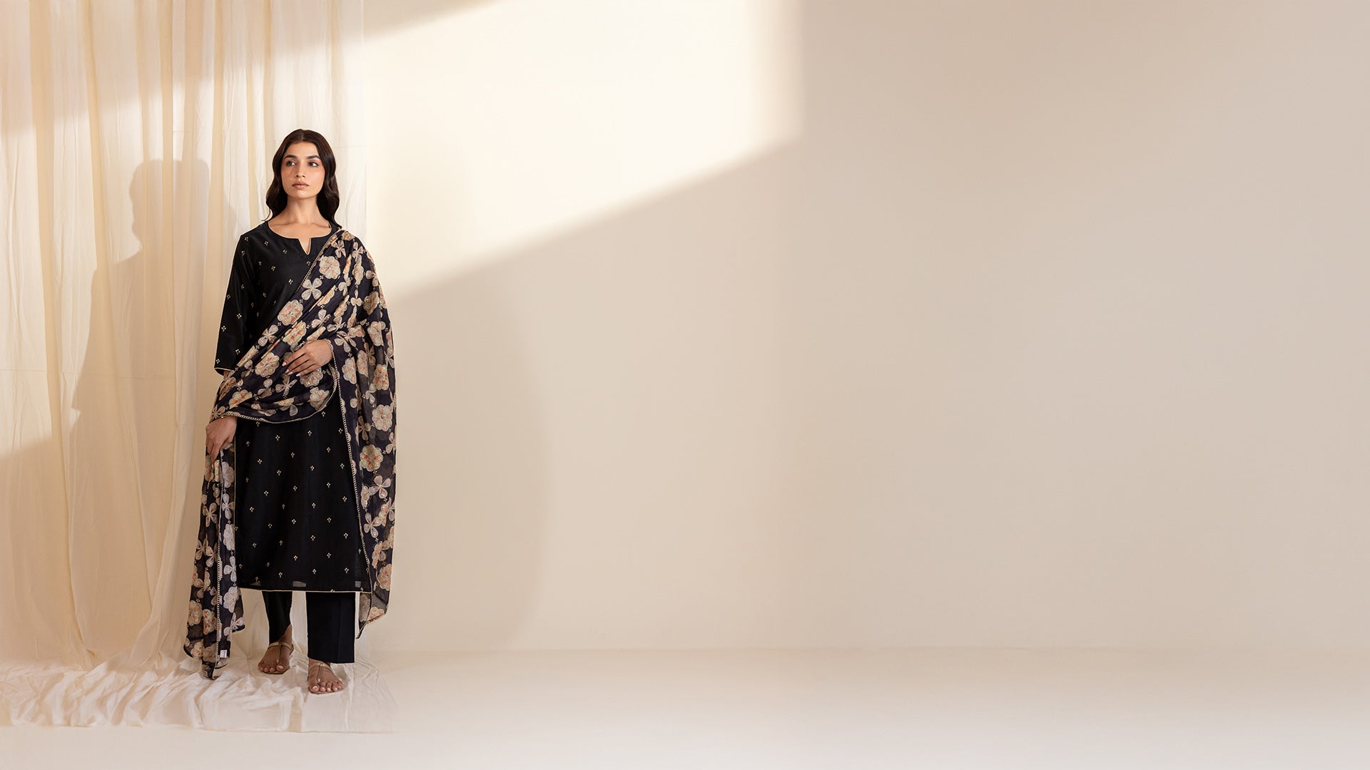 This alluring black Chanderi dupatta features a graceful floral print in pastel browns, greens, and purples. Each bloom is delicately highlighted with machine aari-tari embroidery and golden sequins, adding subtle shimmer. The dupatta is edged all around with golden scalloped lace, bringing an elegant festive finish to its airy, refined silhouette.