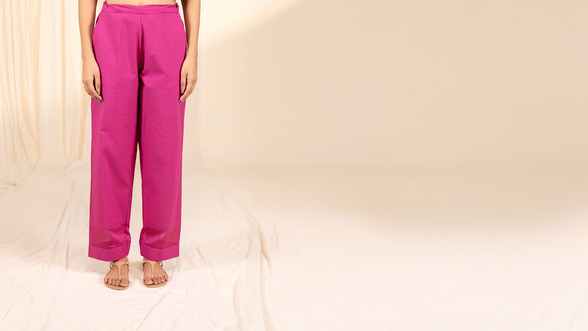 These dark magenta pink cotton pants in straight fit are designed for comfort, they include a semi-elasticised waist with drawstring and two side pockets.