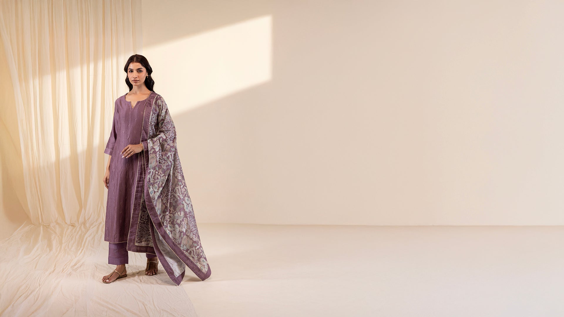 The front of this straight cut Mauve Chanderi Kurta is covered in pintuck detailing and diamond patterns made from gold Mukaish work. It’s split round neckline, 3/4 sleeves and hems are detailed with gold lace scallops for a subtle festive look.