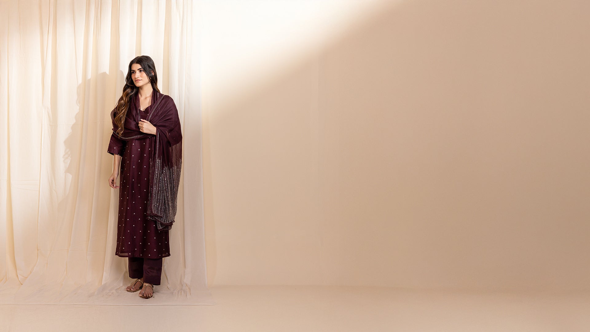 The chocolate wine Chanderi kurta, in a rich and elegant hue, is perfect for festive occasions. Designed in a straight cut and lined with soft voile, its rounded V neck, and 3/4 sleeves are enhanced with clusters of tiny silver sequins all over, offering both style and comfort.