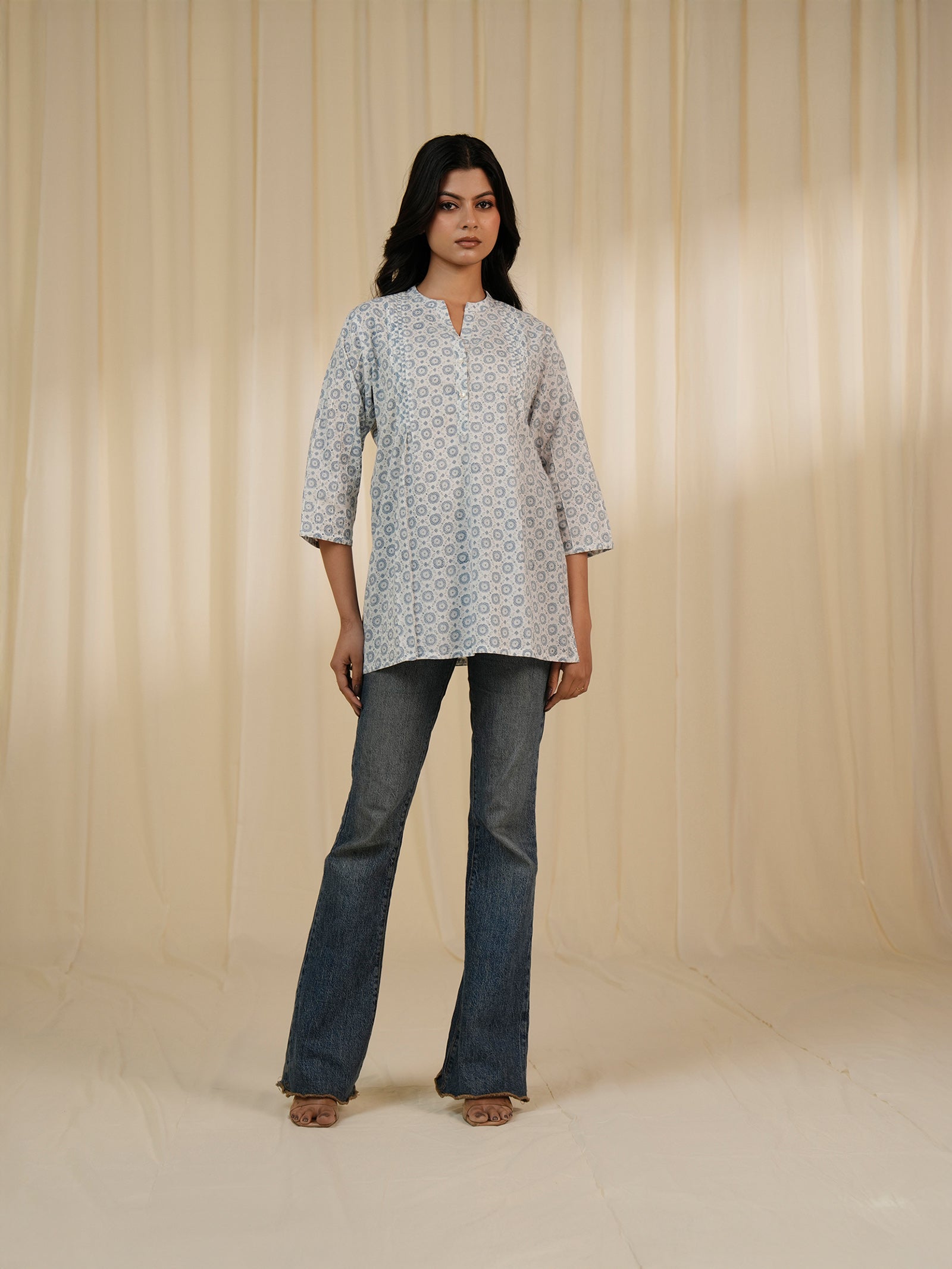 This hand block printed cotton shirt in dusty blue, with a geometric abstract pattern is designed in a relaxed fit. It features a collared neckline and full sleeves, with floral appliqué on the front and back. The gathers at the back add ease, while the front opening features shell buttons.