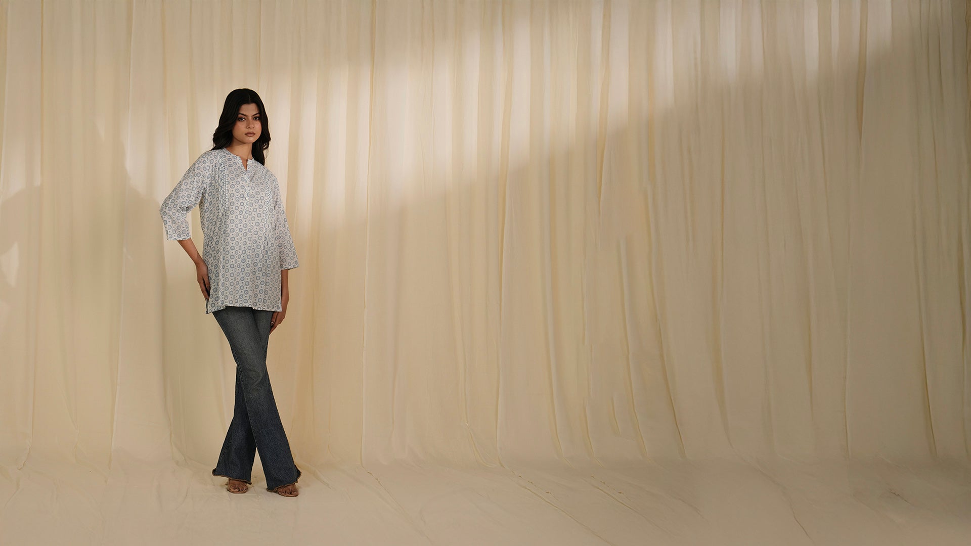 This white cotton mid-length kurti features an all over cool blue hand-block printed floral pattern. Knife pleats on the front yoke and pintucks the sleeves add subtle detailing. It is finished with a mandarin-collar and a half button down opening adorned with shell buttons.