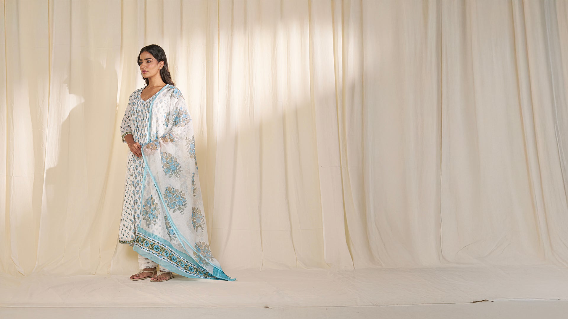 Hand printed kurta on a white base with light blue and beige flowers, featuring green stems and leaves. The panelled princess cut creates a fit-and-flare silhouette. The central panel boasts larger flowers with knife pleats and a silver sequined V neckline, while a floral border trims the sleeves and hem. It includes two functional side pockets and is lined with voile for comfort.