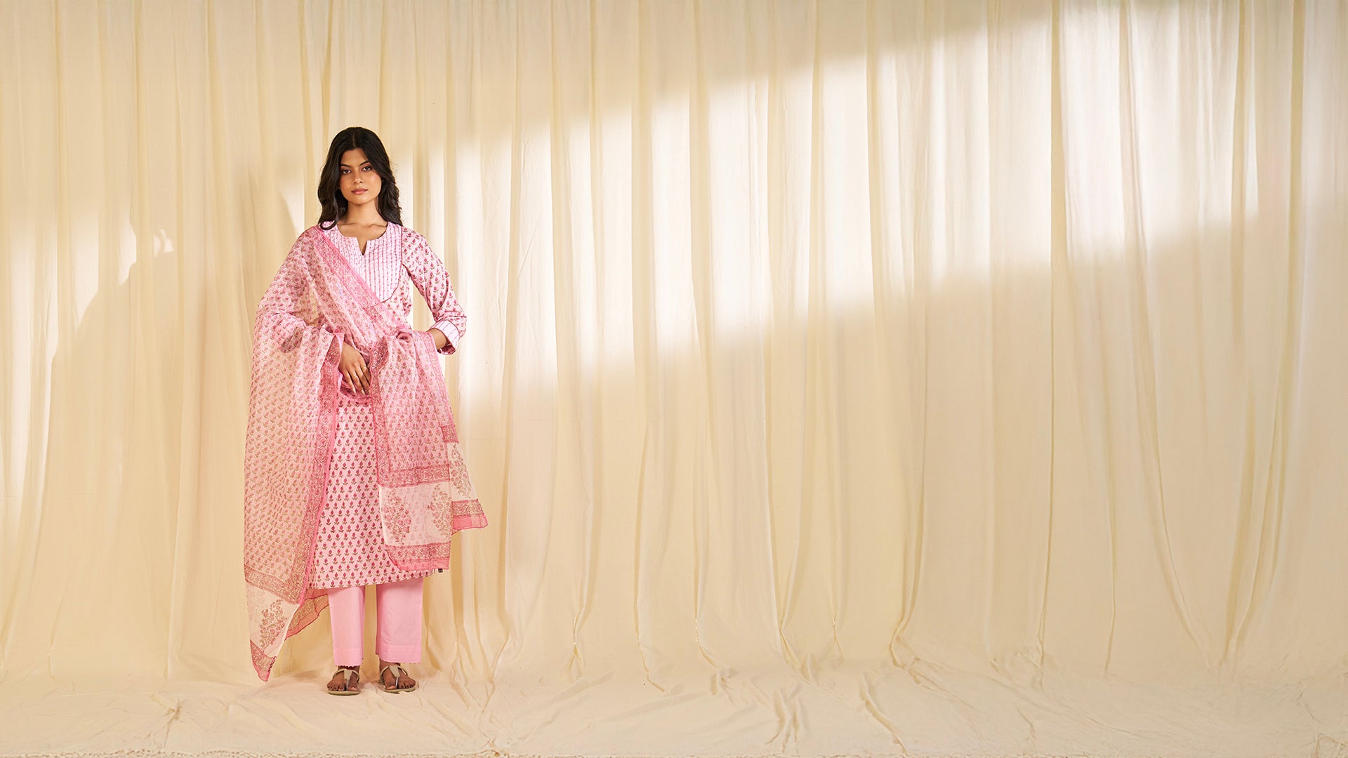 This baby pink straight-cut cotton kurta is hand block printed with small pink flowers nestled between green leaves. Designed with a split round neckline and gathers below the yoke. The three-quarter sleeves cuffs and yoke feature knife pleats highlighted with pink Kantha needlework, glass beads, and peach lace. Paired dupatta and pants can be bought separately.