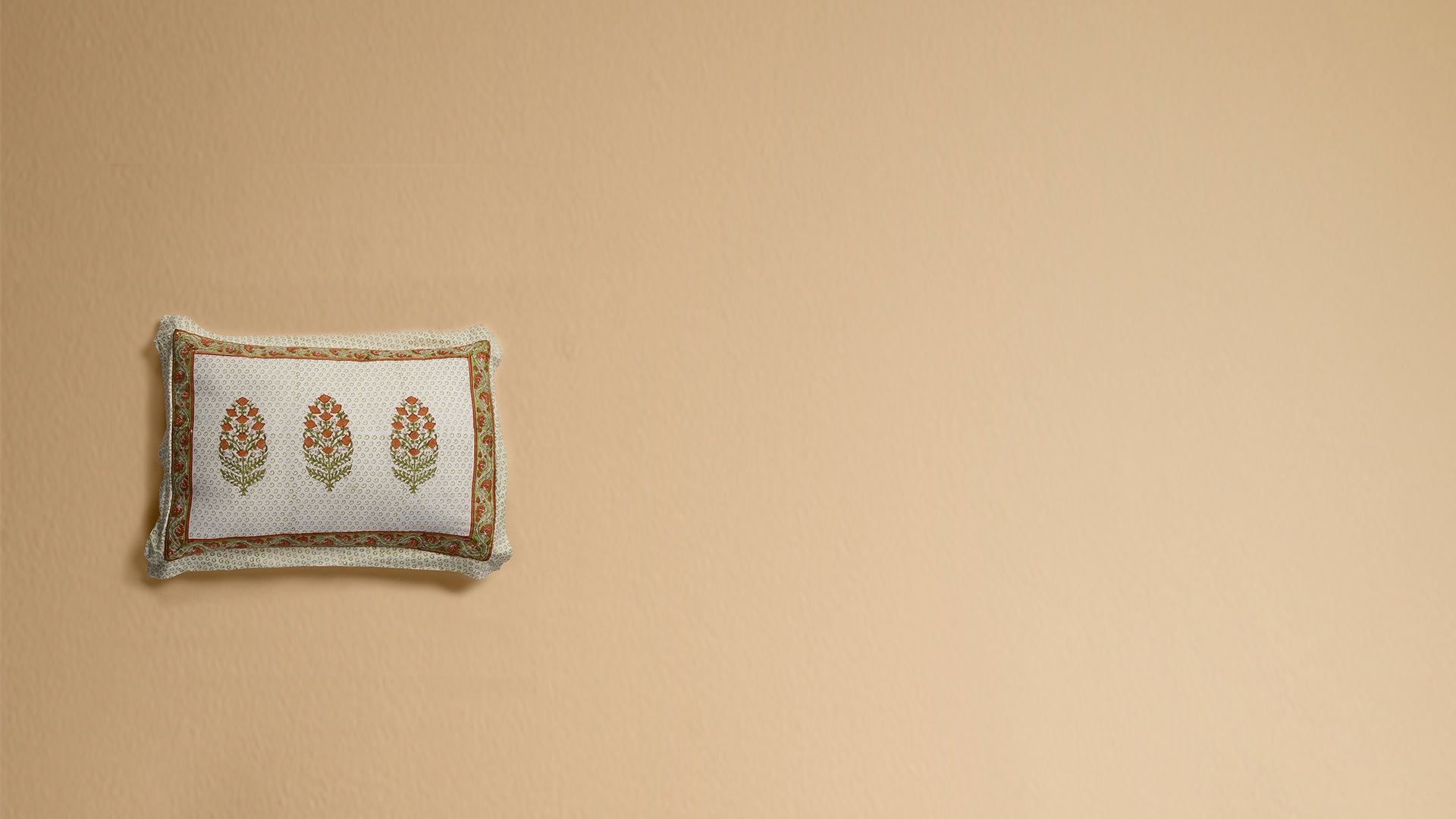 These pillow covers are hand-block printed in rich rusted orange and light leaf green hues. Featuring three large floral motifs framed by delicate borders, they beautifully highlight the art of placement printing. They are sold as a set of two and fillers can be bought separately.
