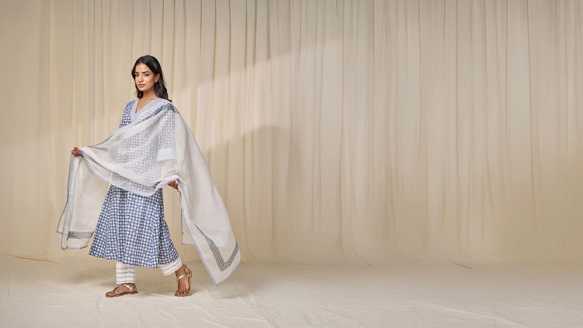 This hand block printed white kota doria dupatta features a geometric Mughal-inspired frame and it is edged with striped fabric hem, combining traditional elegance with contemporary style.