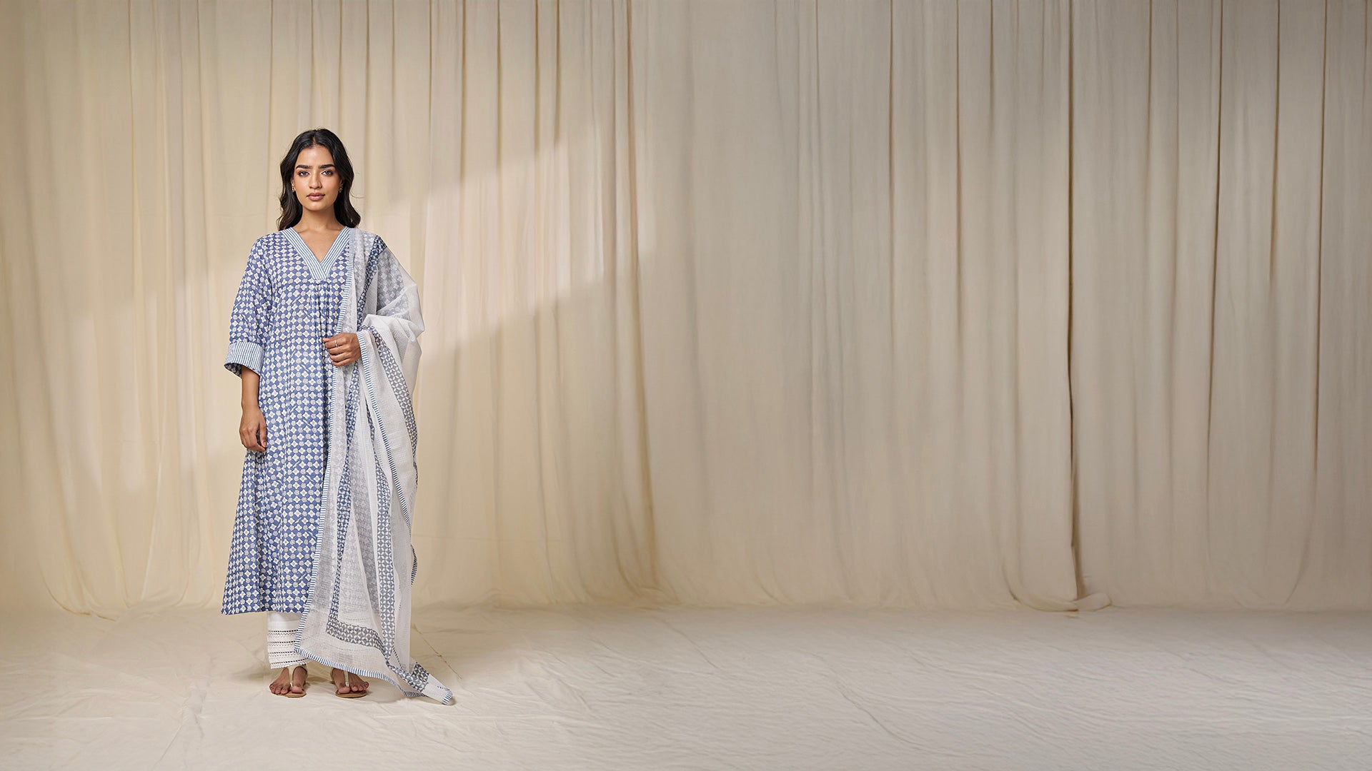 This hand block printed voile kurta features a monochrome grey-blue geometric floral and bird print. Its fit and flare silhouette with pintuck yoke are offset by a striking stripe printed V neckline and sleeve cuffs. And of course it has two side pockets for convenience.