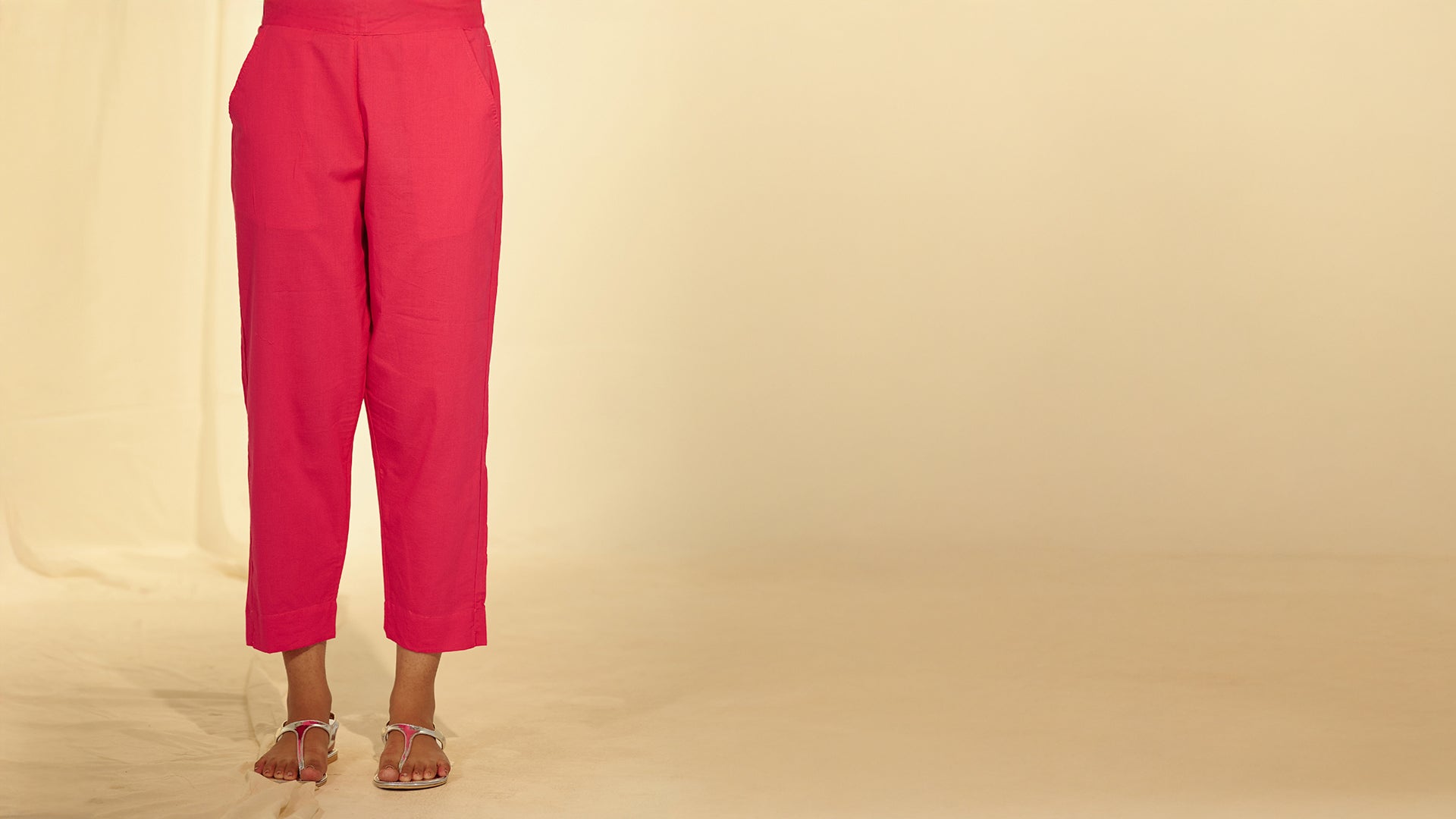 These vibrant hot pink cotton pants offer a comfortable fit with a semi-elasticated waistband, making them perfect for casual or festive occasions. The cropped length adds a trendy touch, while pockets add practicality.