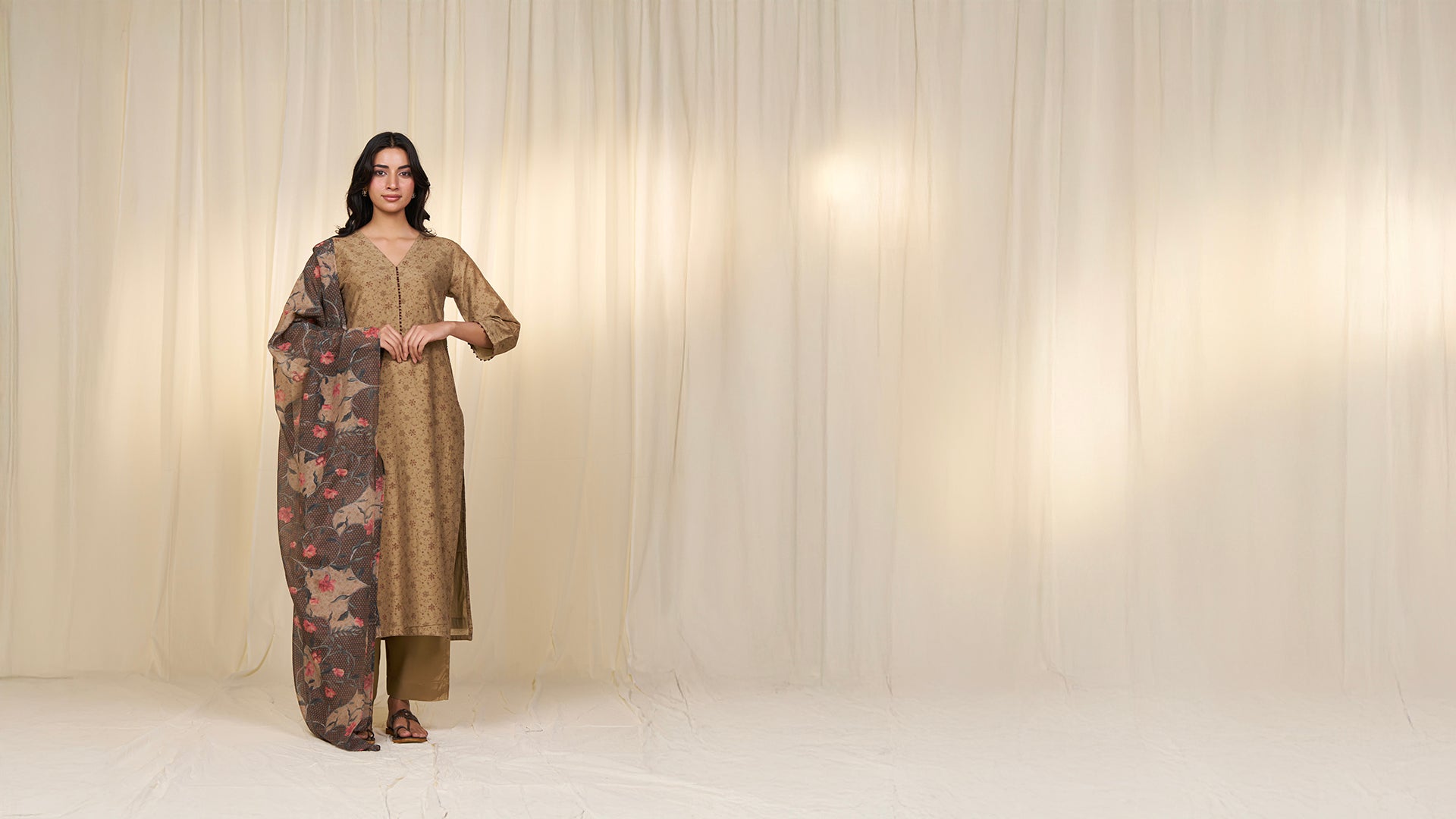 This chanderi dupatta is digitally printed with an attractive floral pattern. Dark peach-pink flowers create striking contrast against the dark brown and beige base, offering a vibrant, lightweight drape perfect for Indian ensembles.
