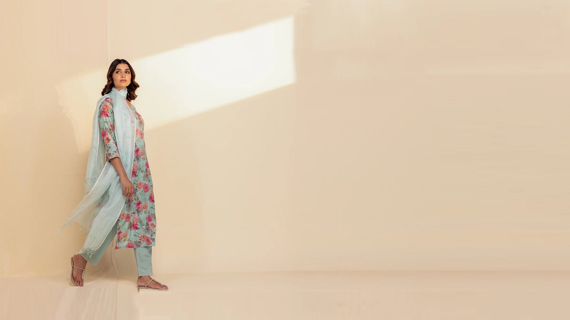 This cotton kurta features a modified round neckline and a stunning floral print in shades of pink, red, and grey. The vibrant flowers, uniquely layered over an aqua-toned floral base print, are beautifully highlighted with shimmering silver zari, adding a touch of festivity to its design.