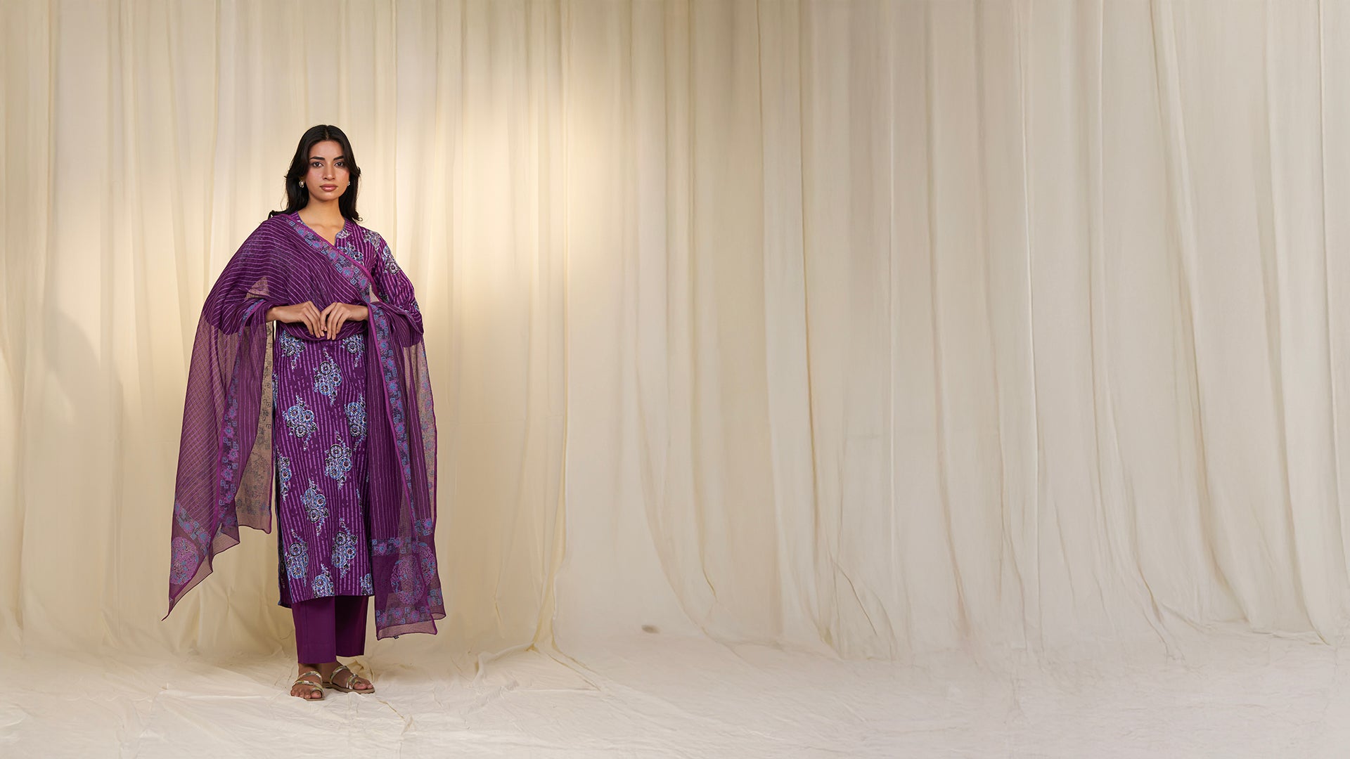 This purple Kota doria dupatta features thin hand block printed purple stripes with floral geometric borders in blue, purple, and black. Large contemporary floral motifs on the palla ends complete the look. Paired kurta and pants can be bought separately.