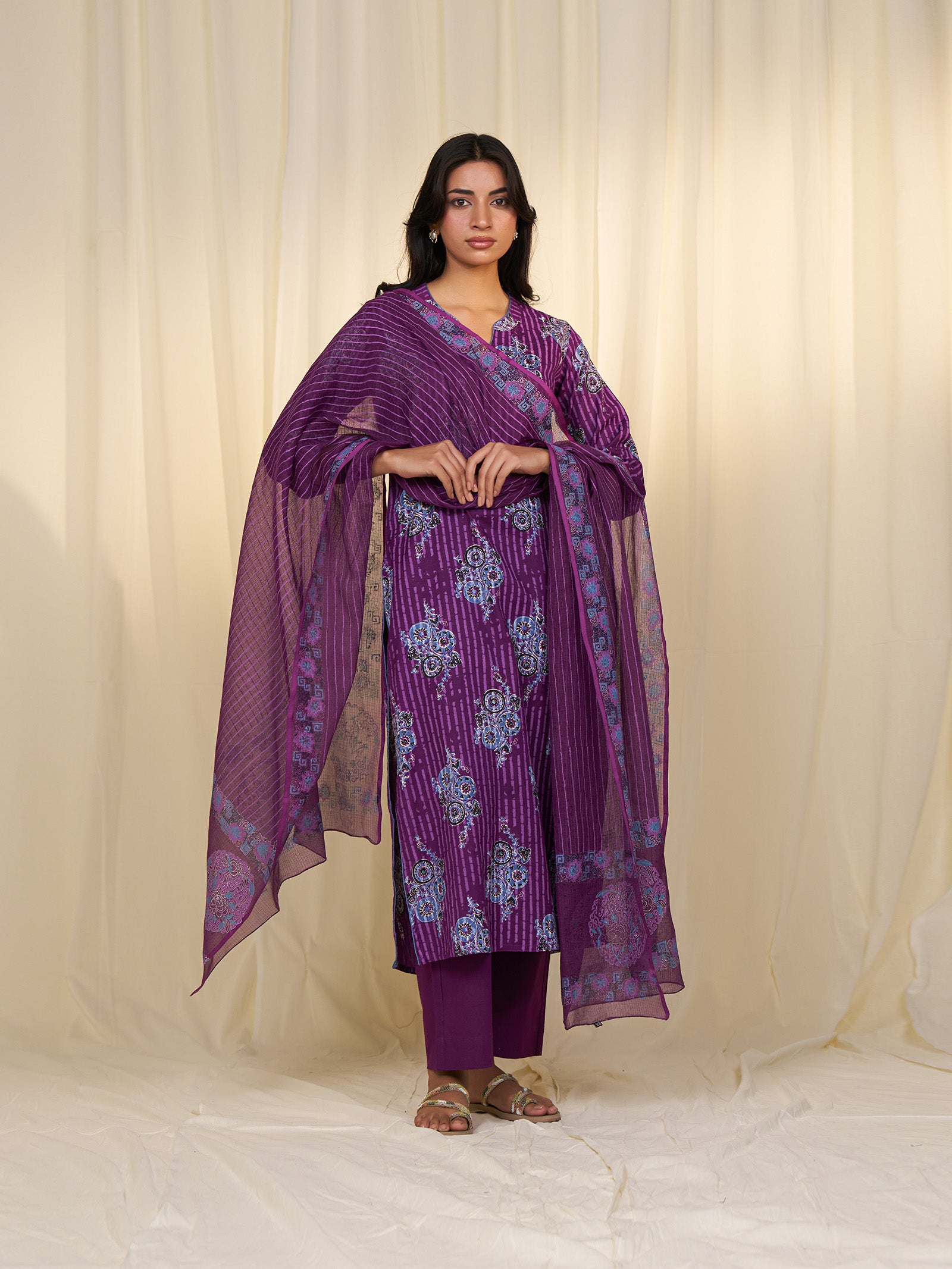 This rich purple Cosmic Twill cotton kurta features a modified V-neckline and a contemporary all-over print of circular floral medallions in soft blue, white and black. A vertical dash motif in light purple, create a subtle striped backdrop. It is designed in a straight-cut fit with three-fourth sleeves and finished with fine blue piping along all seams.