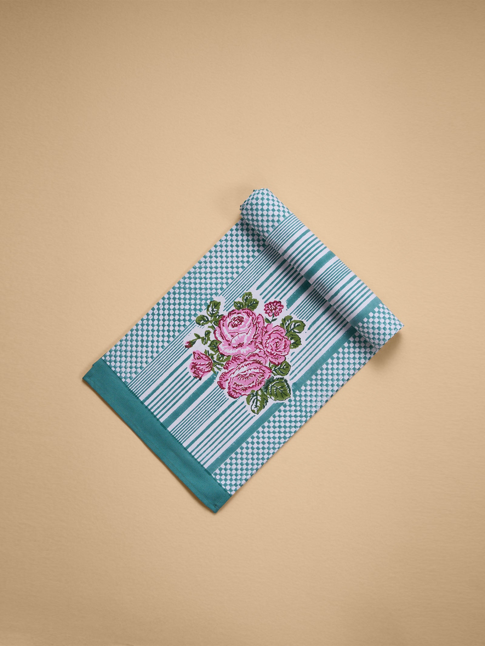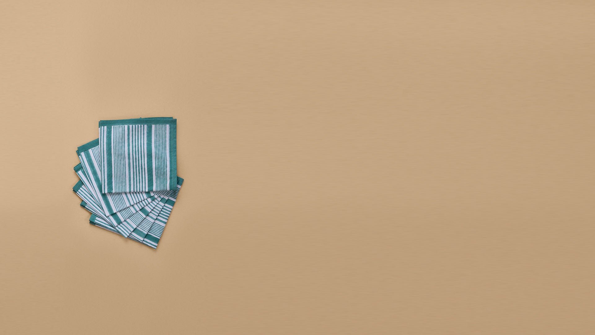 These elegant dinner napkins feature bold and thin pastel sea green stripes in a timeless design. Hand block printed for a refined finish, they are sold as a coordinated set of six, making them a stylish addition to any dining setting.