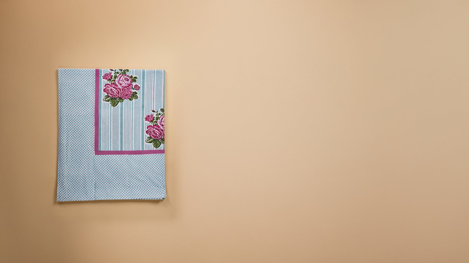 This table cover combines bold florals with structured geometry for a striking contemporary look. Large pink roses with green leaves are hand block printed in clusters over pastel sea green stripes of varying thickness. A pink frame divides the center print from the fine checkerboard print border, enhancing its modern elegance.