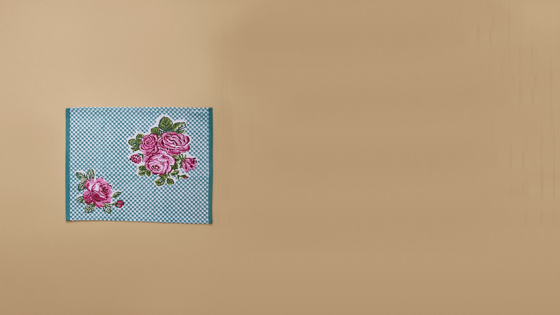 These hand block printed placemats feature a pastel sea green base of tiny checks, overlaid with pink roses that create a subtle three-dimensional effect. Designed to resemble the softness of a watercolor painting, the print lends a contemporary yet artistic charm, making these placemats a stylish accent for any table.