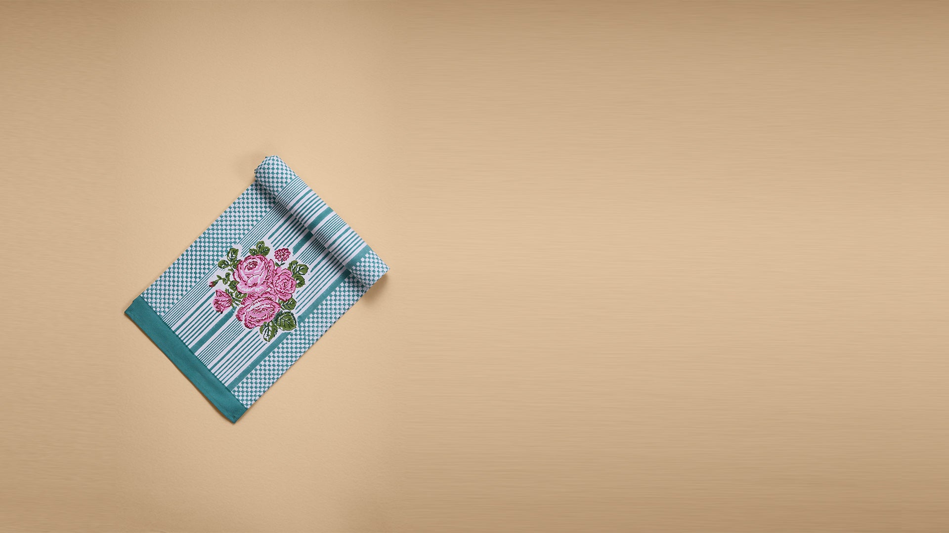 This table runner features a contemporary blend of geometry and florals. Tiny Pastel Sea Green checks frame thick and thin stripes. Large pink roses, printed in a watercolor effect, overlay the stripes, creating a soft artistic charm. The balance of structured patterns and delicate blooms makes it a striking, modern accent for any table.