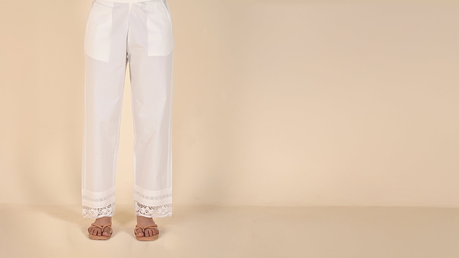 These cream-colored cotton pants feature delicate lace inserts near the hem. Designed for comfort, they have a semi-elasticized waist, a drawstring, and two side pockets.