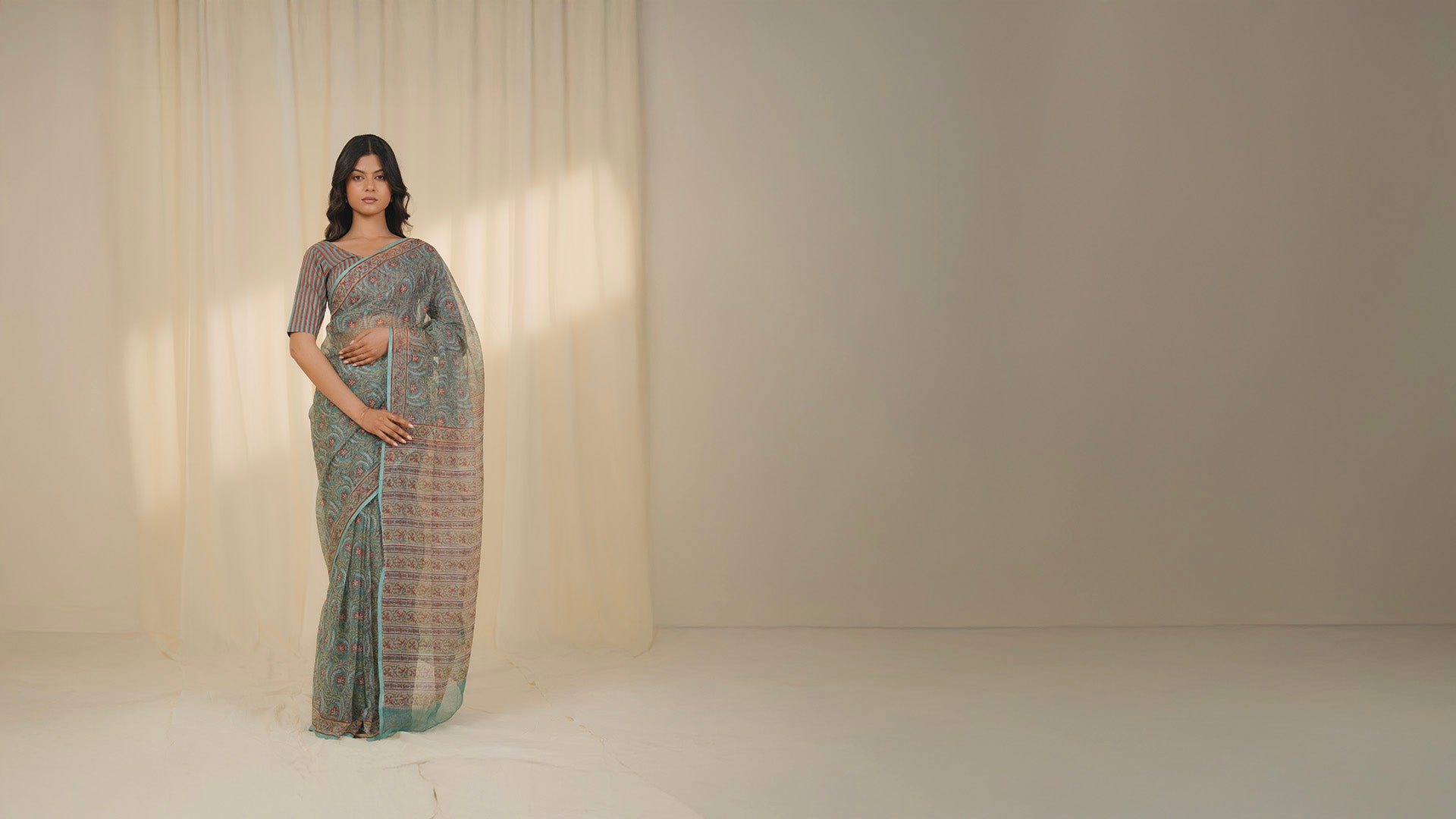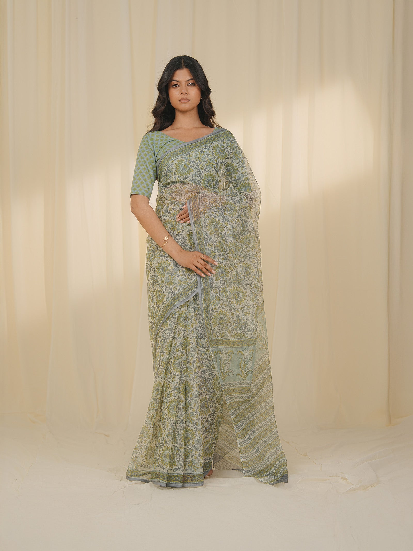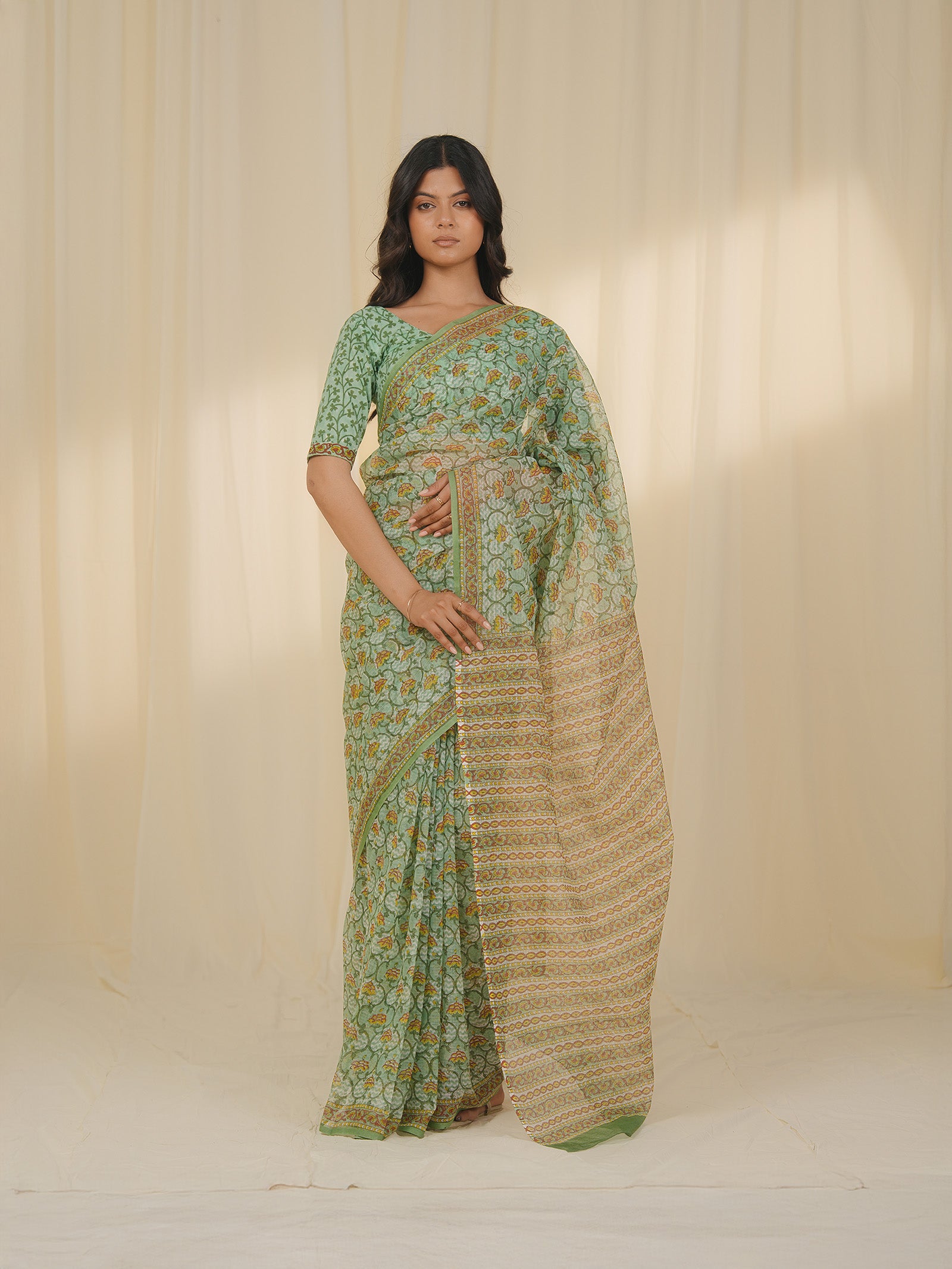 This hand block printed Kota Doria saree features an all-over pattern of red flowers entwined with leafy vines in turquoise and light beige on a dark teal base. It is framed with intricate floral borders, while the palla showcases alternating floral vine stripes. It comes with an attached stripe printed blouse piece.