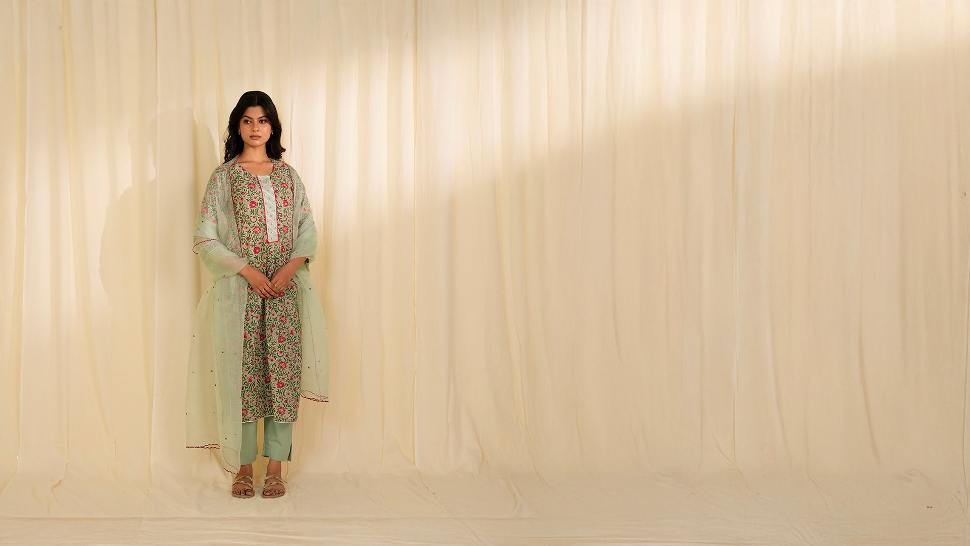 This straight cut cotton kurta features hand printed peach and dark red flowers with forest green vines, on a moss green base. The front-open round neckline is finished with a placket embellished in silver gota, sequins, and red beads. The 3/4 sleeves feature organza inserts detailed with sequins, beads, and gota lace. The side slits and hem are finished with gota lace. Paired dupatta and pants can be bought separately.